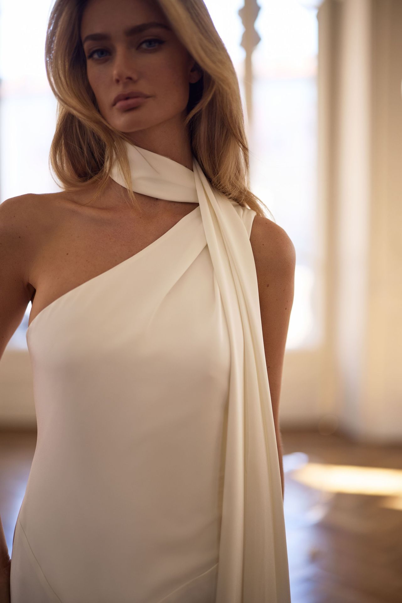Statement bridal scarf crafted from Italian satin, effortlessly draping from the neckline for a fluid, sculptural effect.