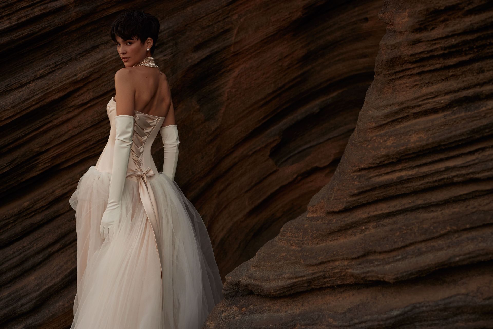 Elegant satin opera gloves are designed to add a timeless refinement to the bridal look.