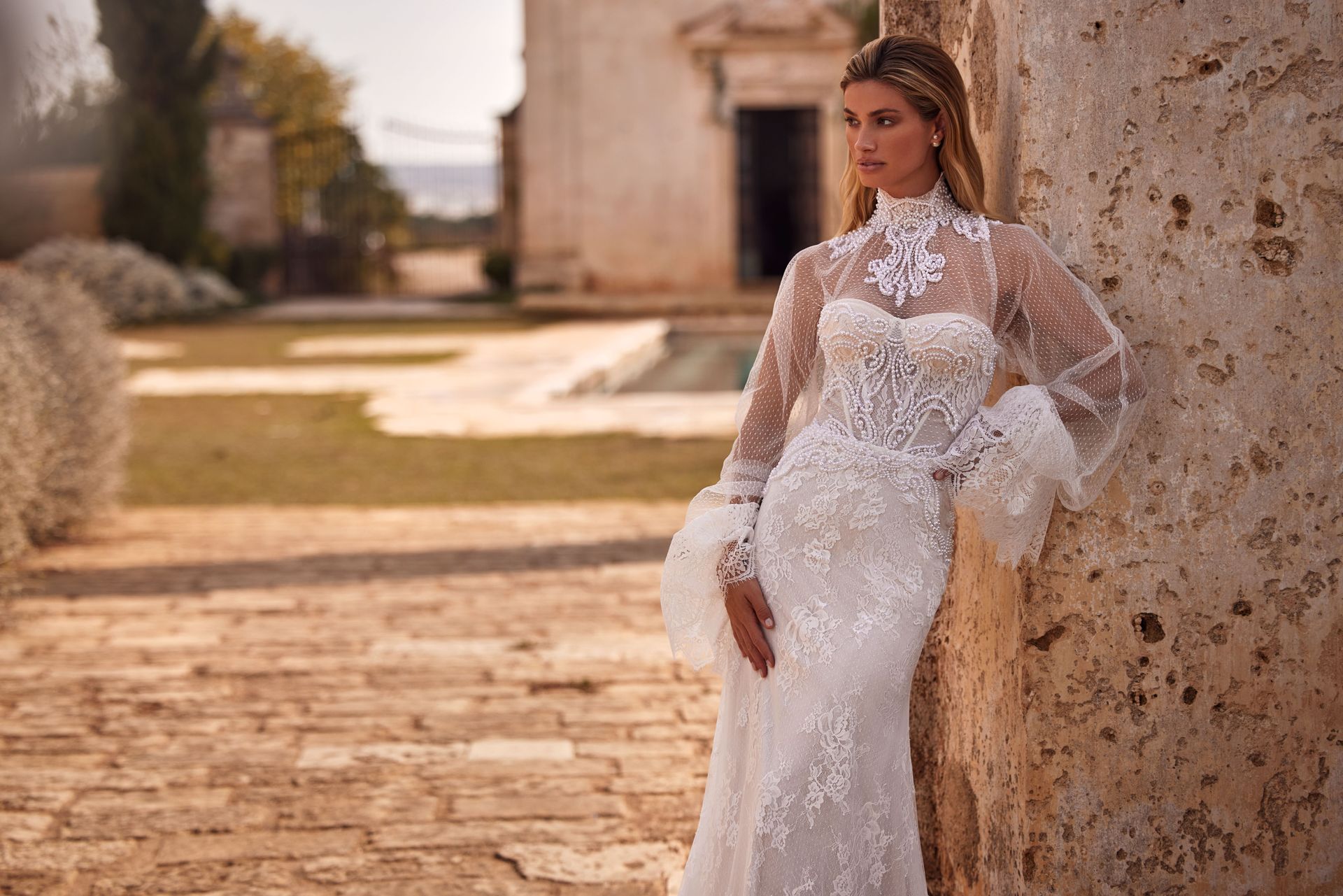 Victorian-era-inspired chantilly lace turtleneck bolero made of exclusive sheer lace with a polka-dot pattern. The bolero features a turtleneck decorated with pearl embellishment and puffy sleeves with two layers of lace cuffs.