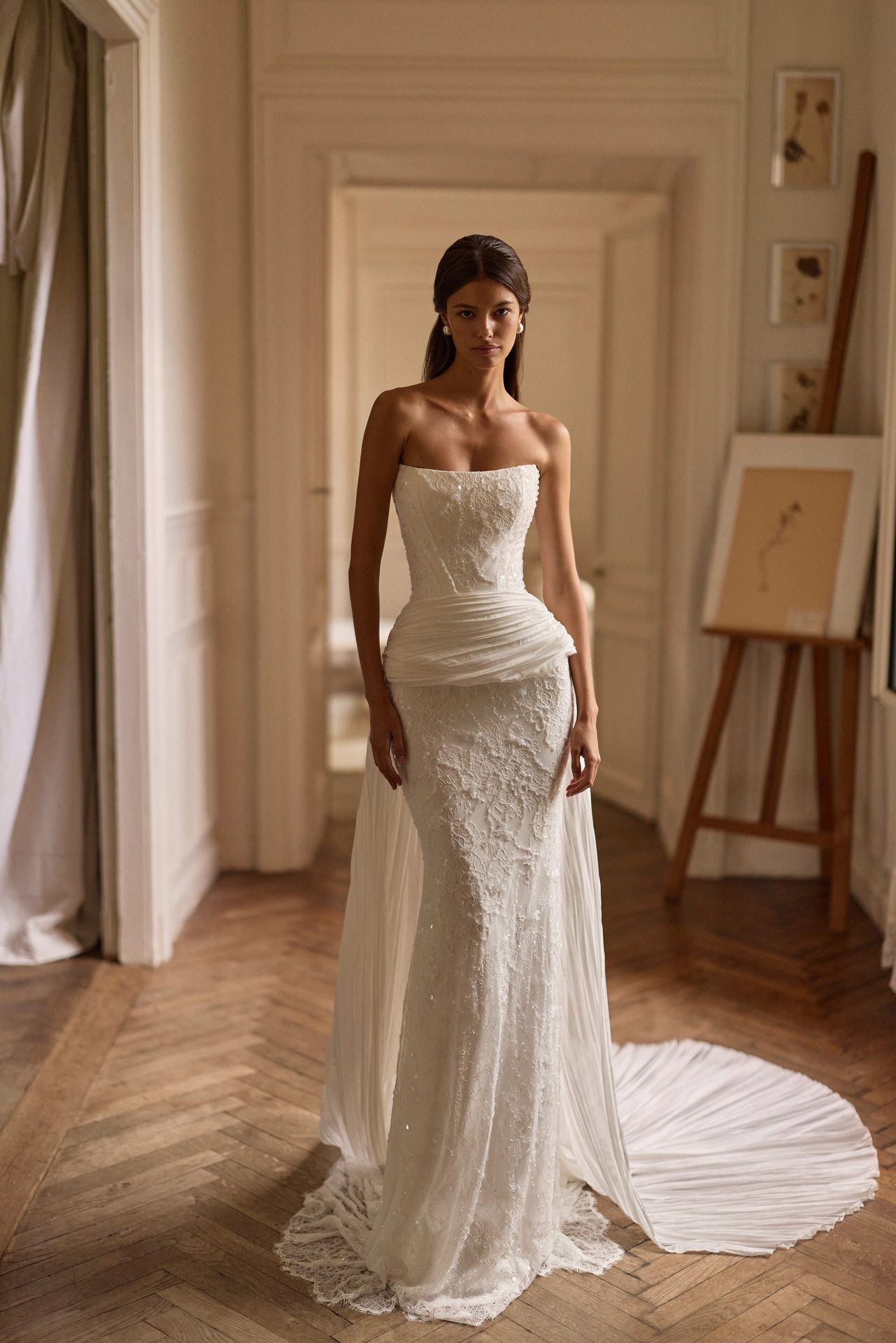 An ideal finishing touch for those seeking a dramatic, sculptural silhouette, perfectly complementing the Evolis, Glowline, or Avenara gown.