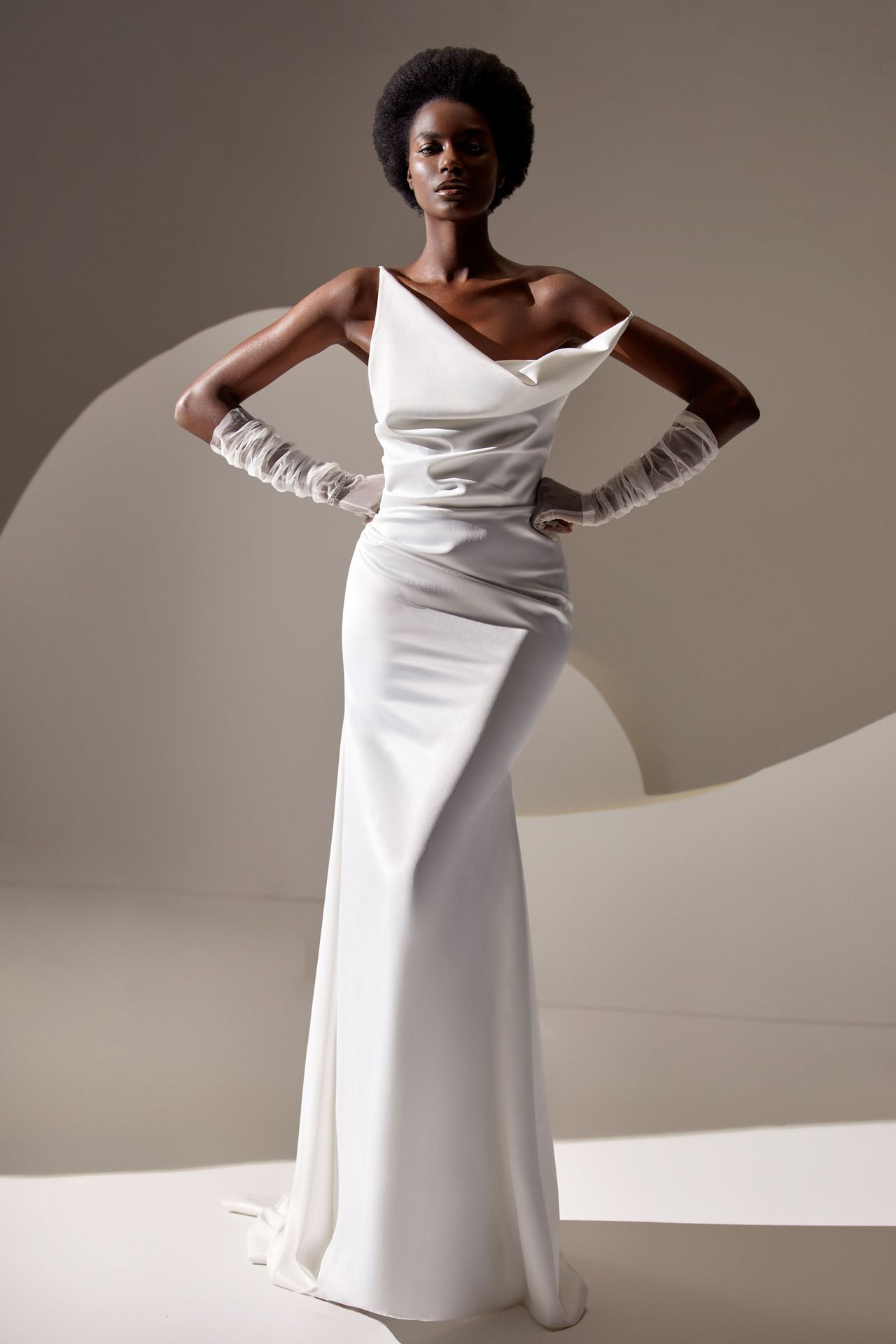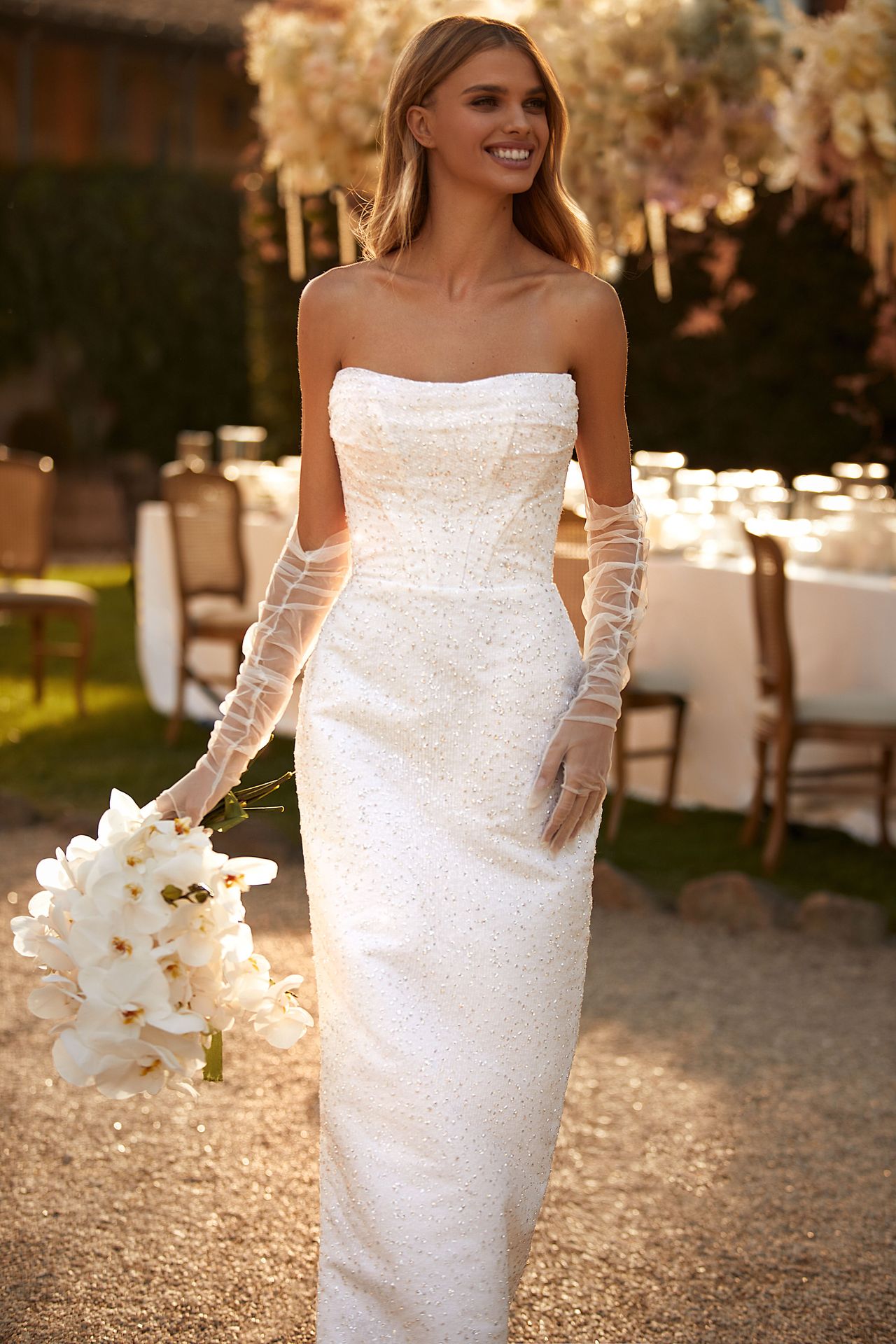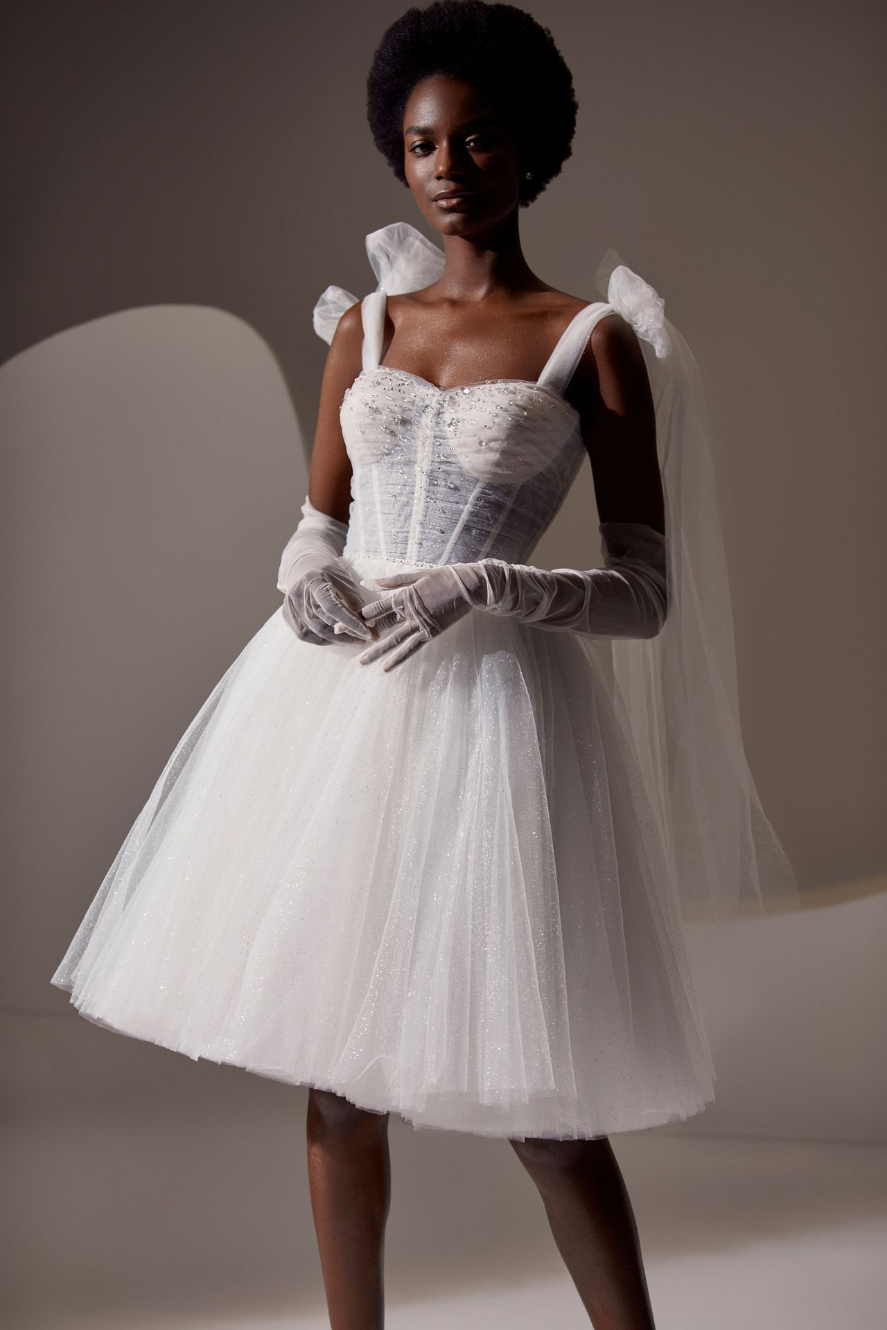 Elegant sheer-white opera-length tulle gloves.