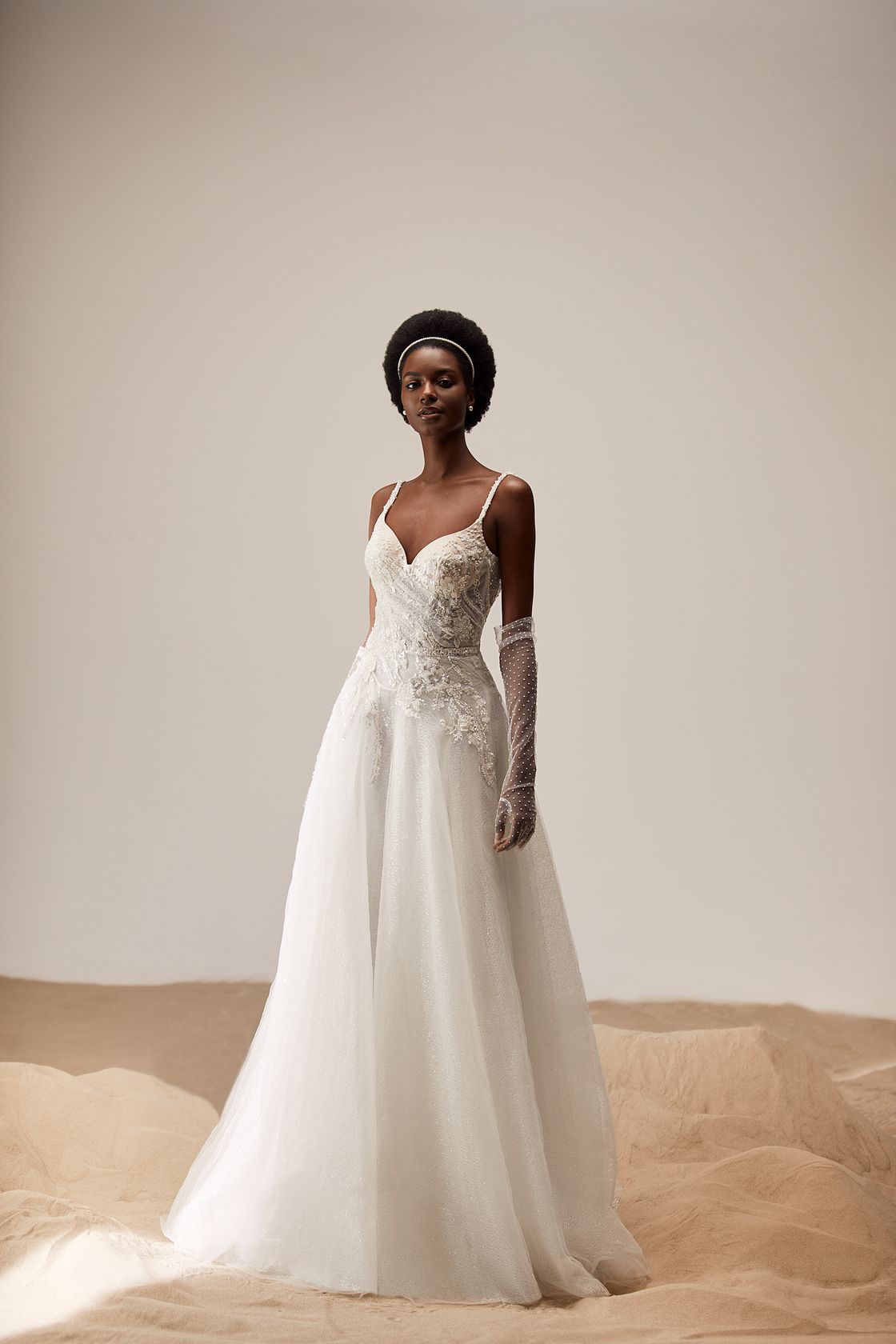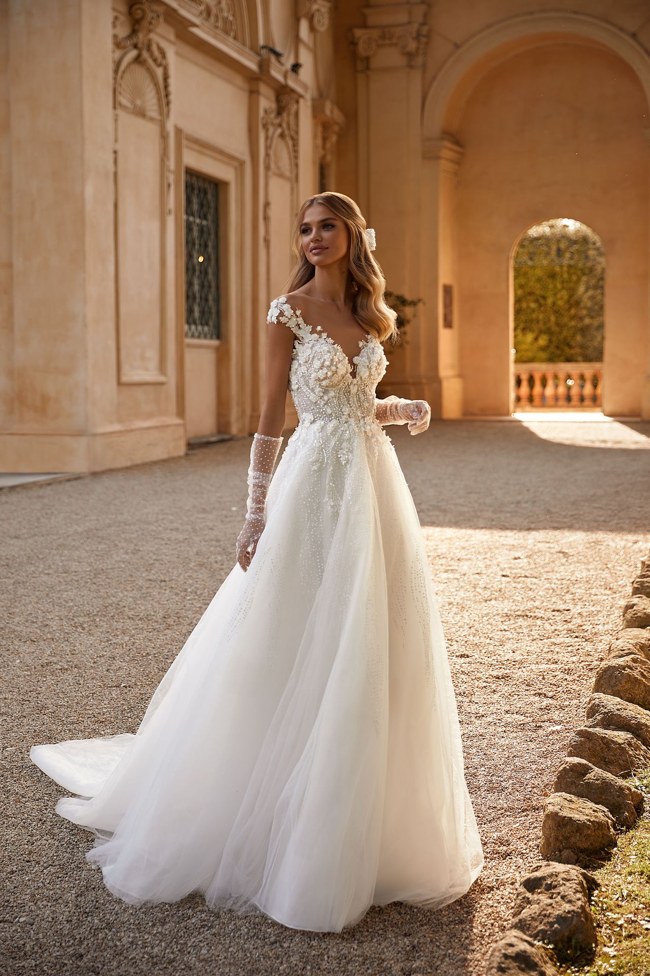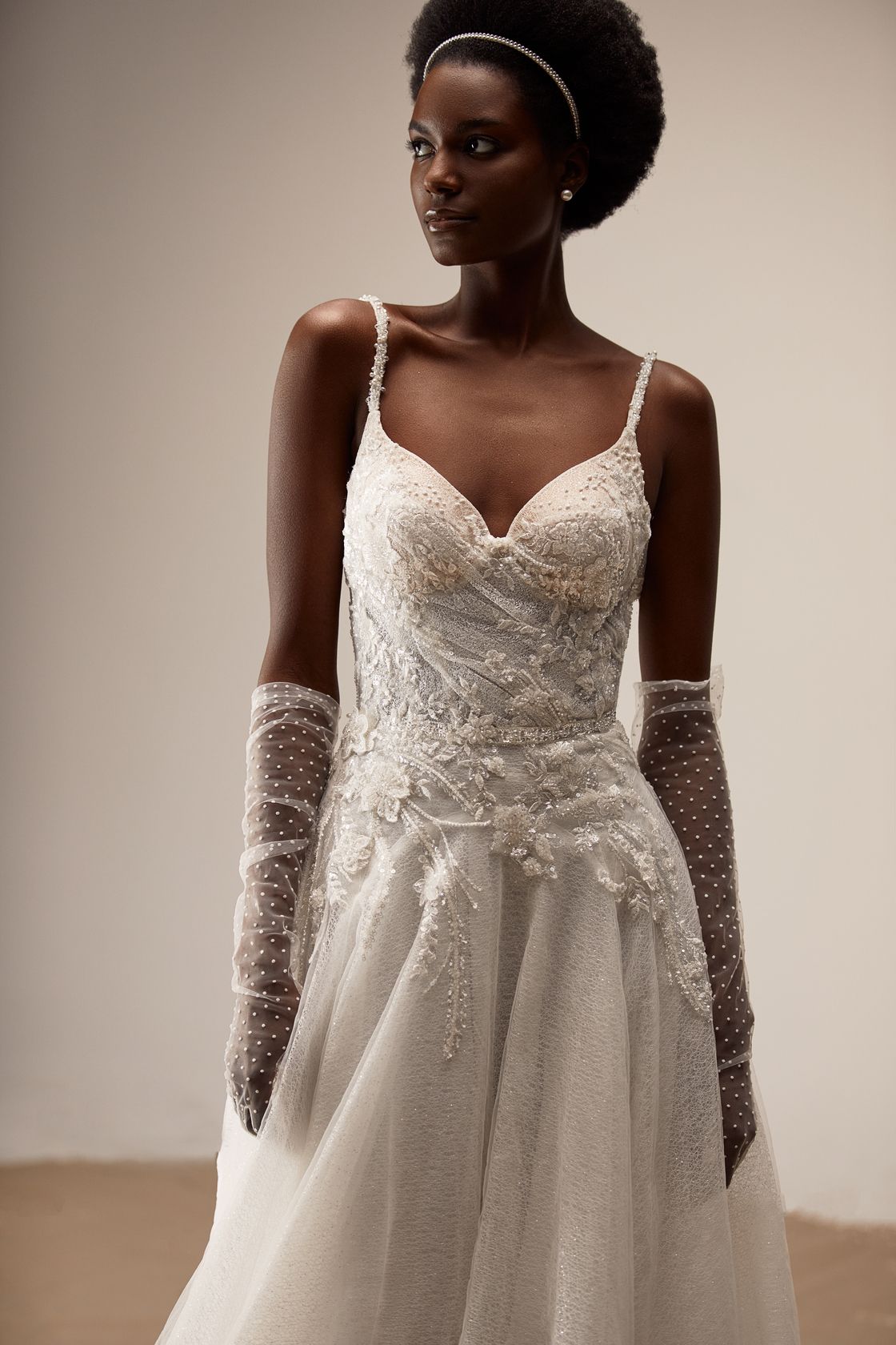 Tender sheer-white tulle gloves with playful polka dots pattern.