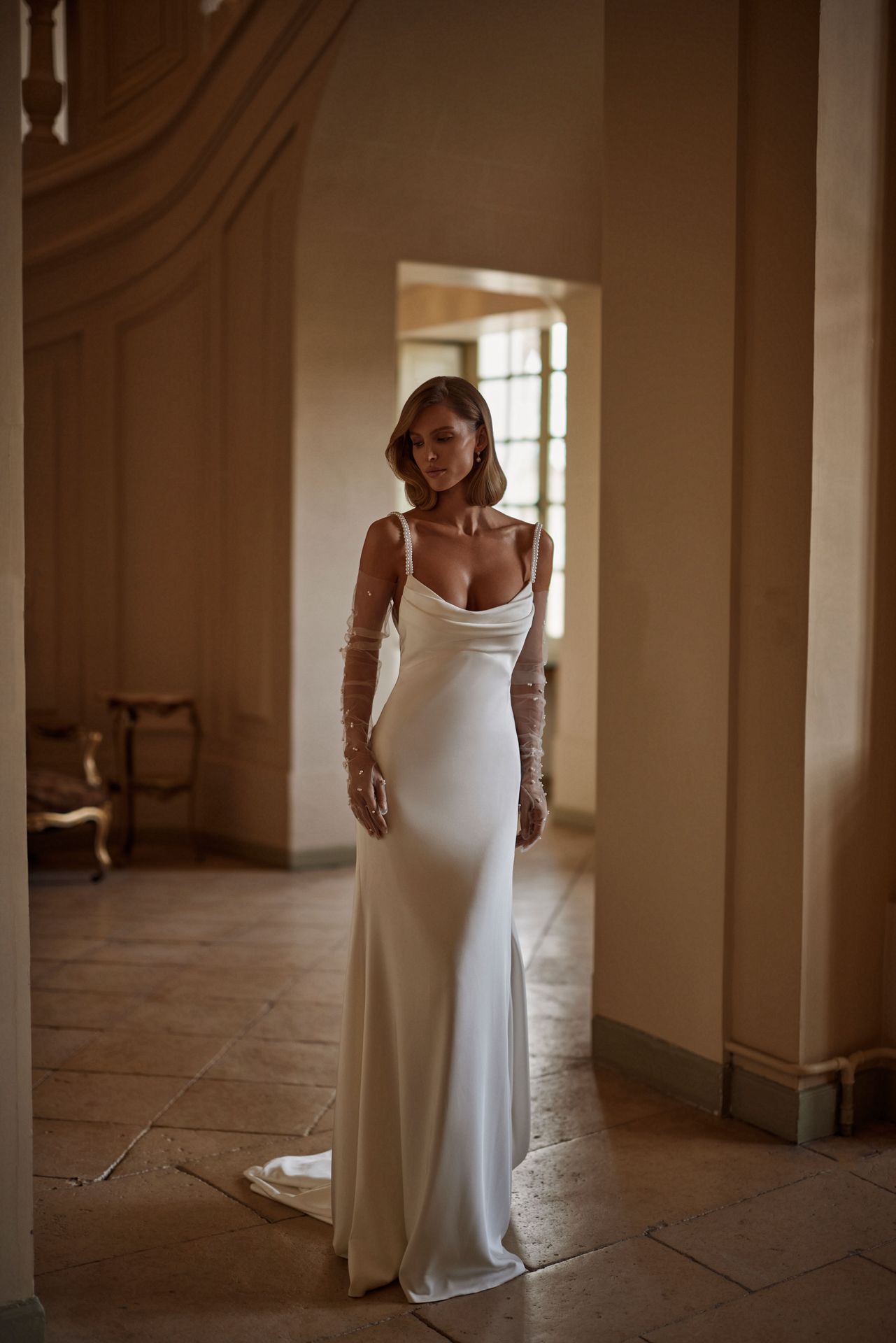 Delicate sheer opera gloves, sprinkled with pearls throughout the whole length.