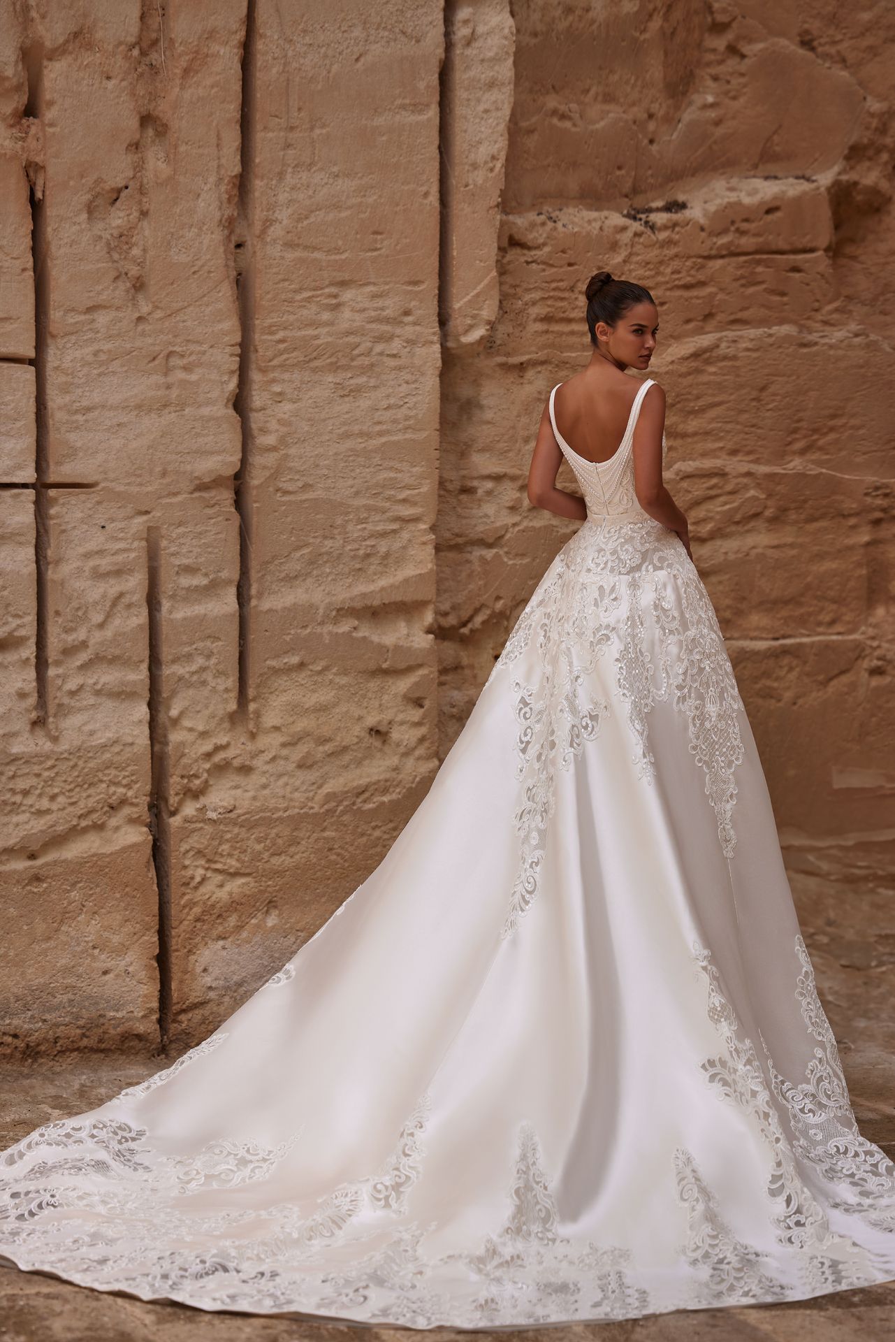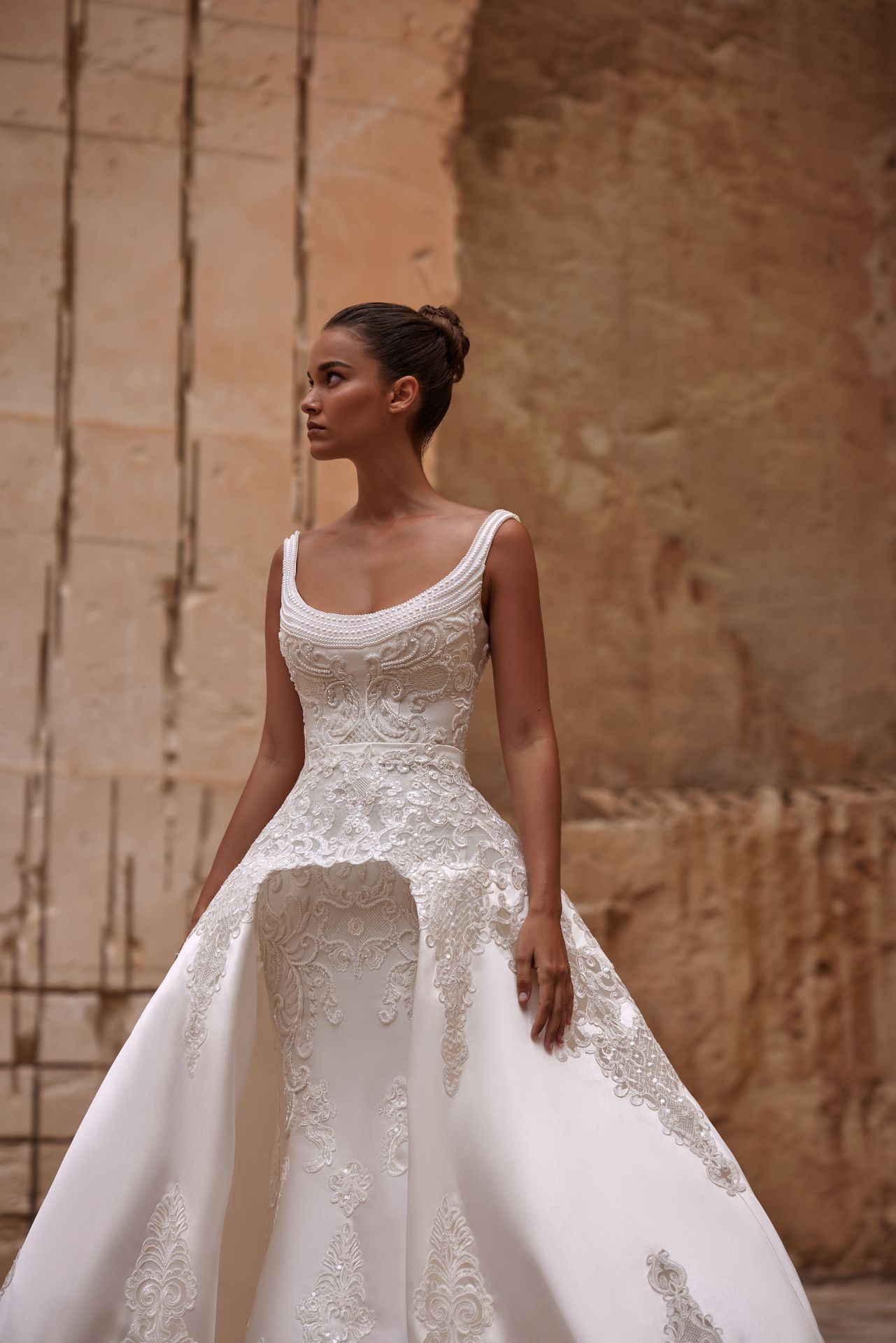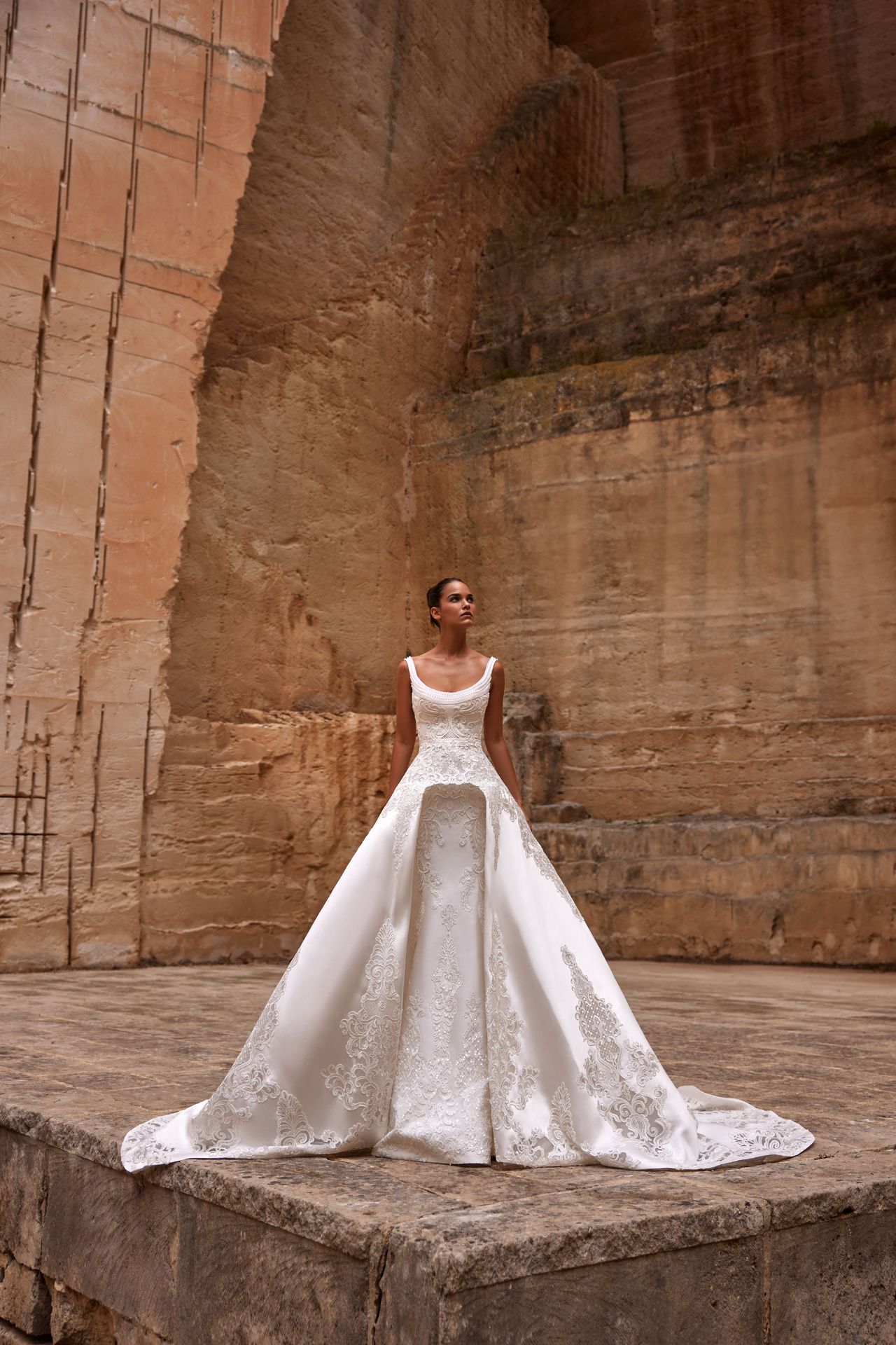 Majestic detachable cathedral train fashioned from mikado and embellished with lux floral sequined lace appliques. The train is designed to mimic a full skirt while simultaneously revealing the front of the wedding gown.