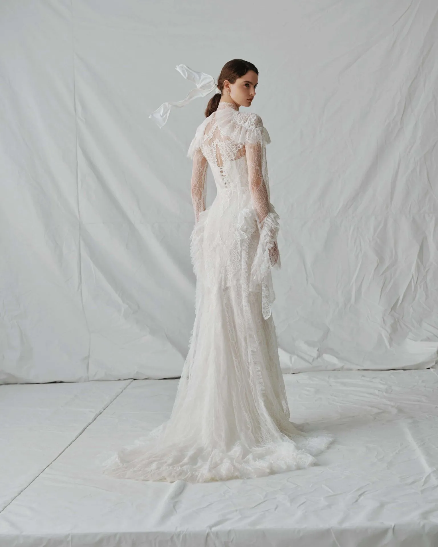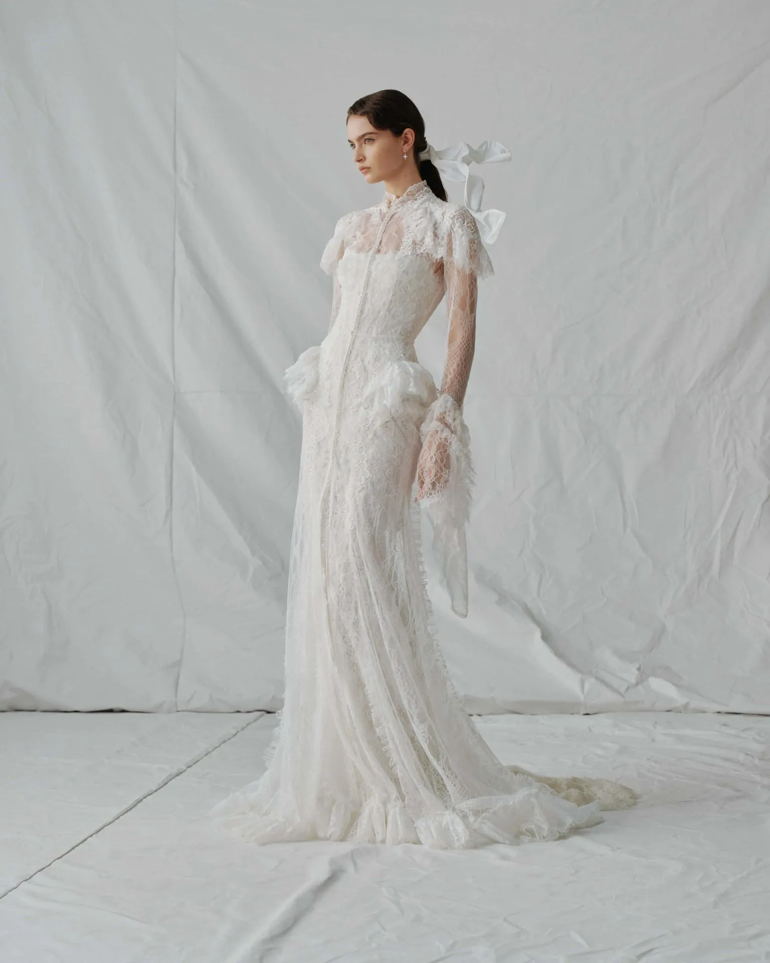 A sheer Chantilly lace robe with a high neckline, long sleeves, and an elongated silhouette. Ruffled details at the shoulders, cuffs, and hips add softness, texture, and a more dramatic layered effect.