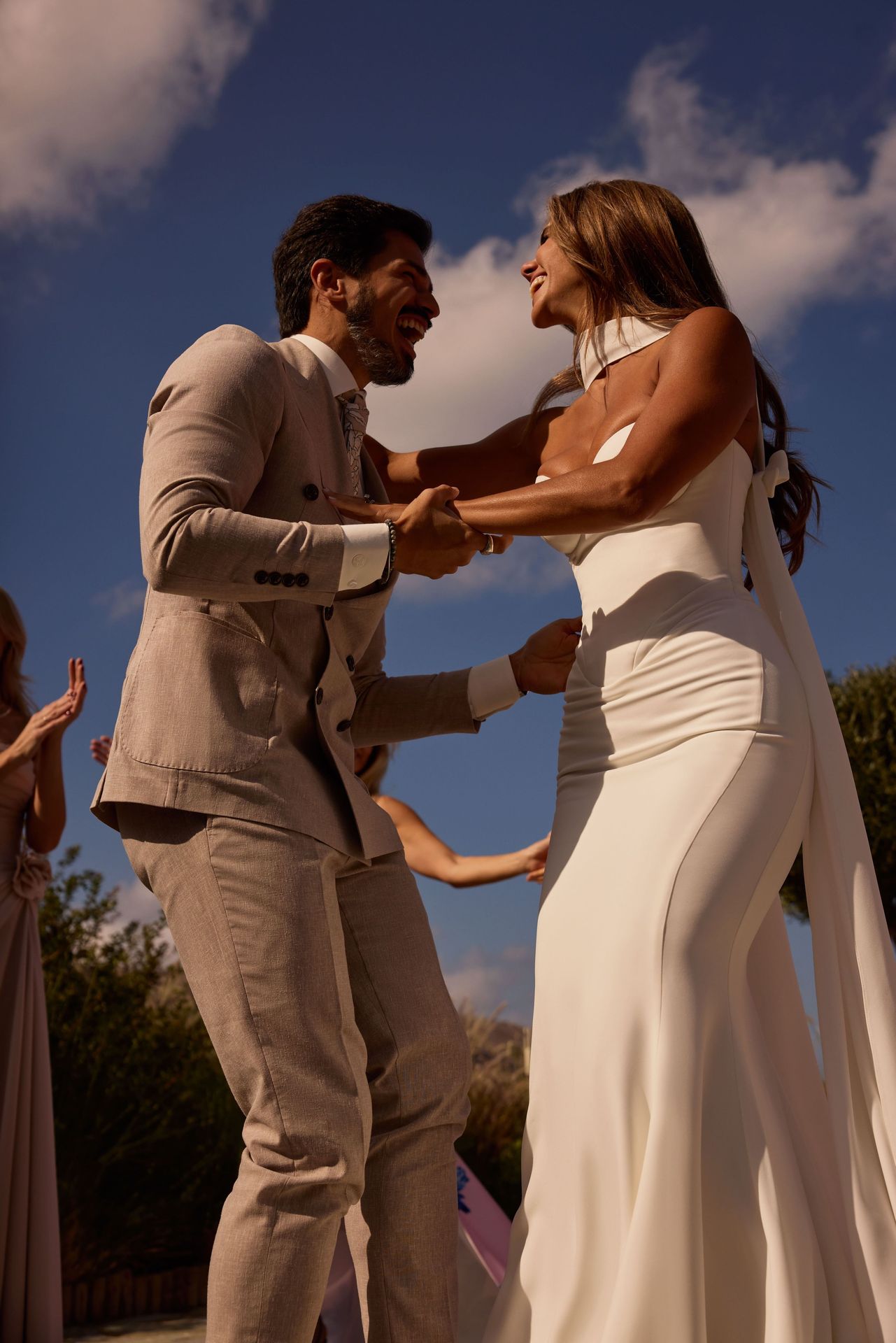 Sophisticated flowing bridal scarf crafted from satin adorned with delicate bow accents. This accessory adds a touch of softness and drama to Mirela gown.