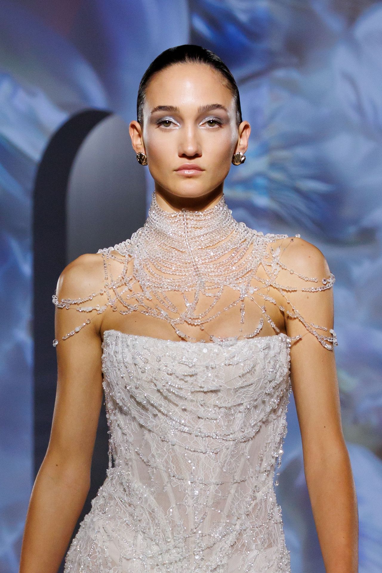 Statement neckpiece fashioned from an intricate web of clear crystal beads cascading from a high, structured collar that wraps elegantly around the neck. The design creates a regal, armor-like effect, blending delicate craftsmanship with bold sophistication.