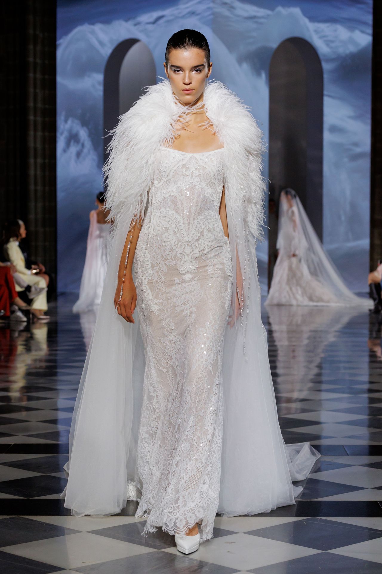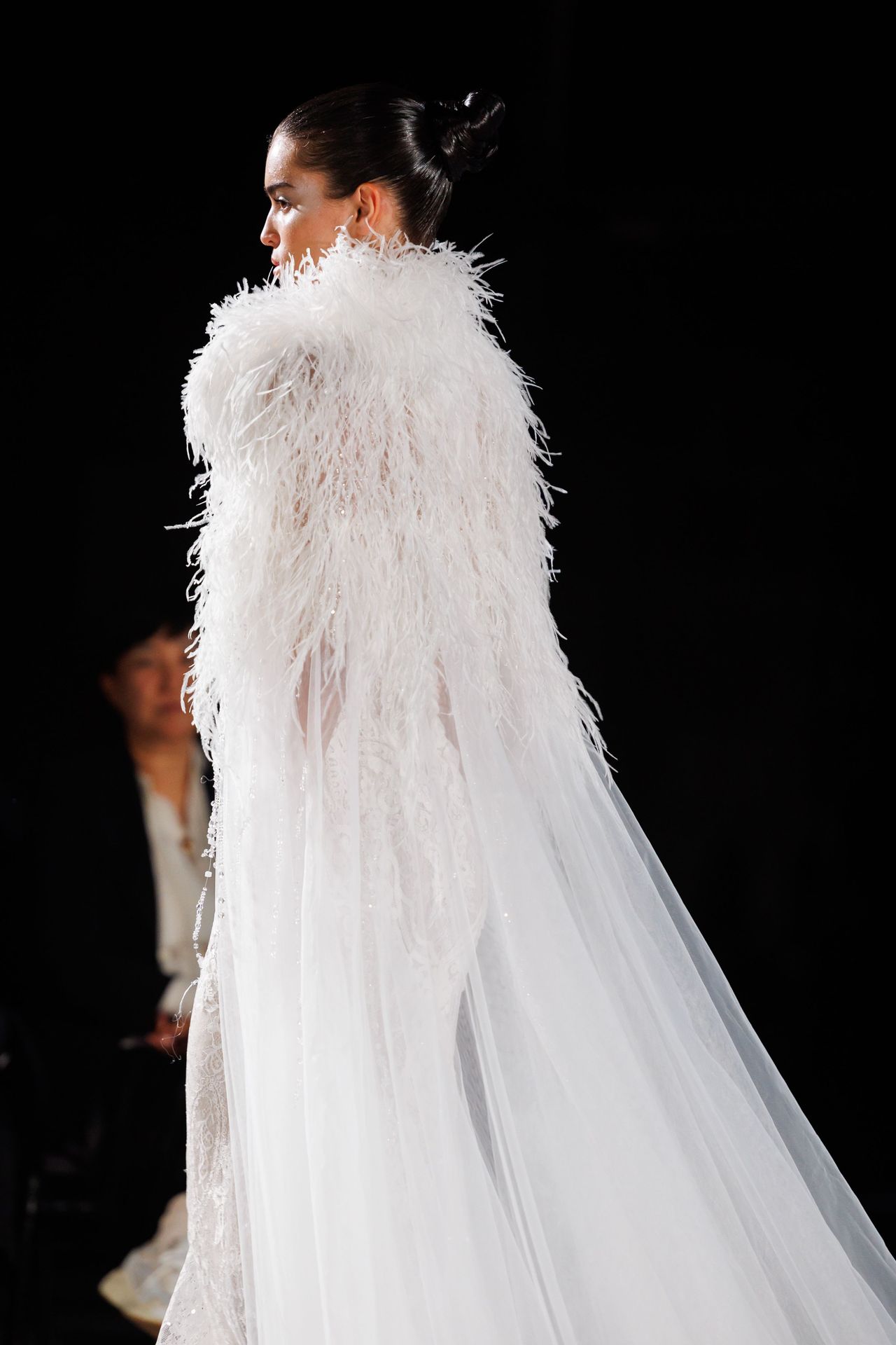 Vougeish translucent tulle cape, meticulously trimmed by hand with ostrich feathers and adorned with hand-placed crystals. This statement accessory is sure to be a showstopper, adding zest to any look.