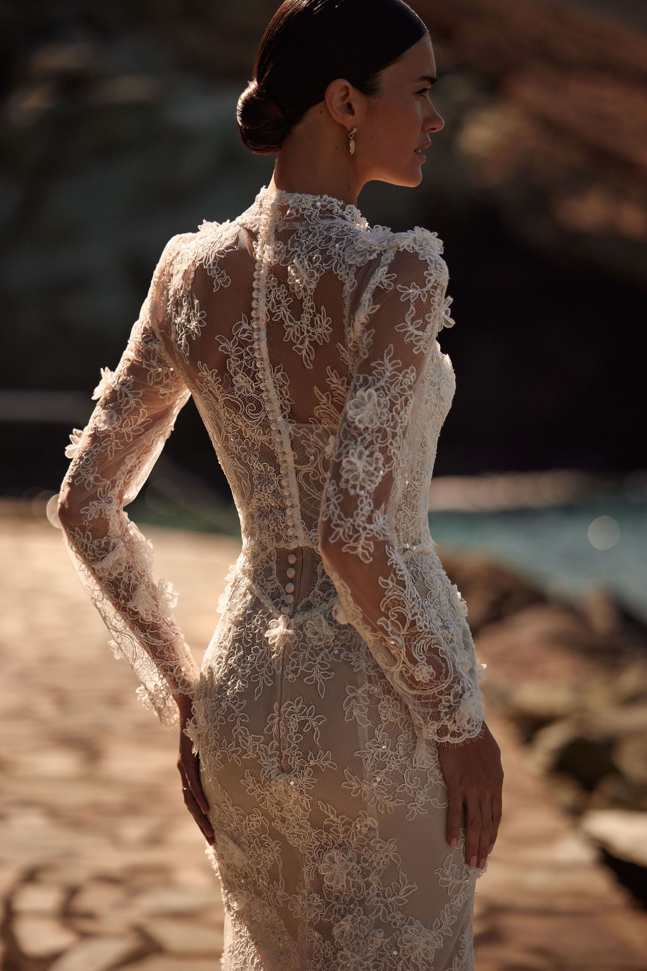Delicate semi-sheer bolero fashioned from intricate chantilly floral lace. Featuring a high neckline and long sleeves, subtle scalloped edges, and a buttoned closed back. This design offers full coverage while maintaining a sheer, lightweight aesthetic.
