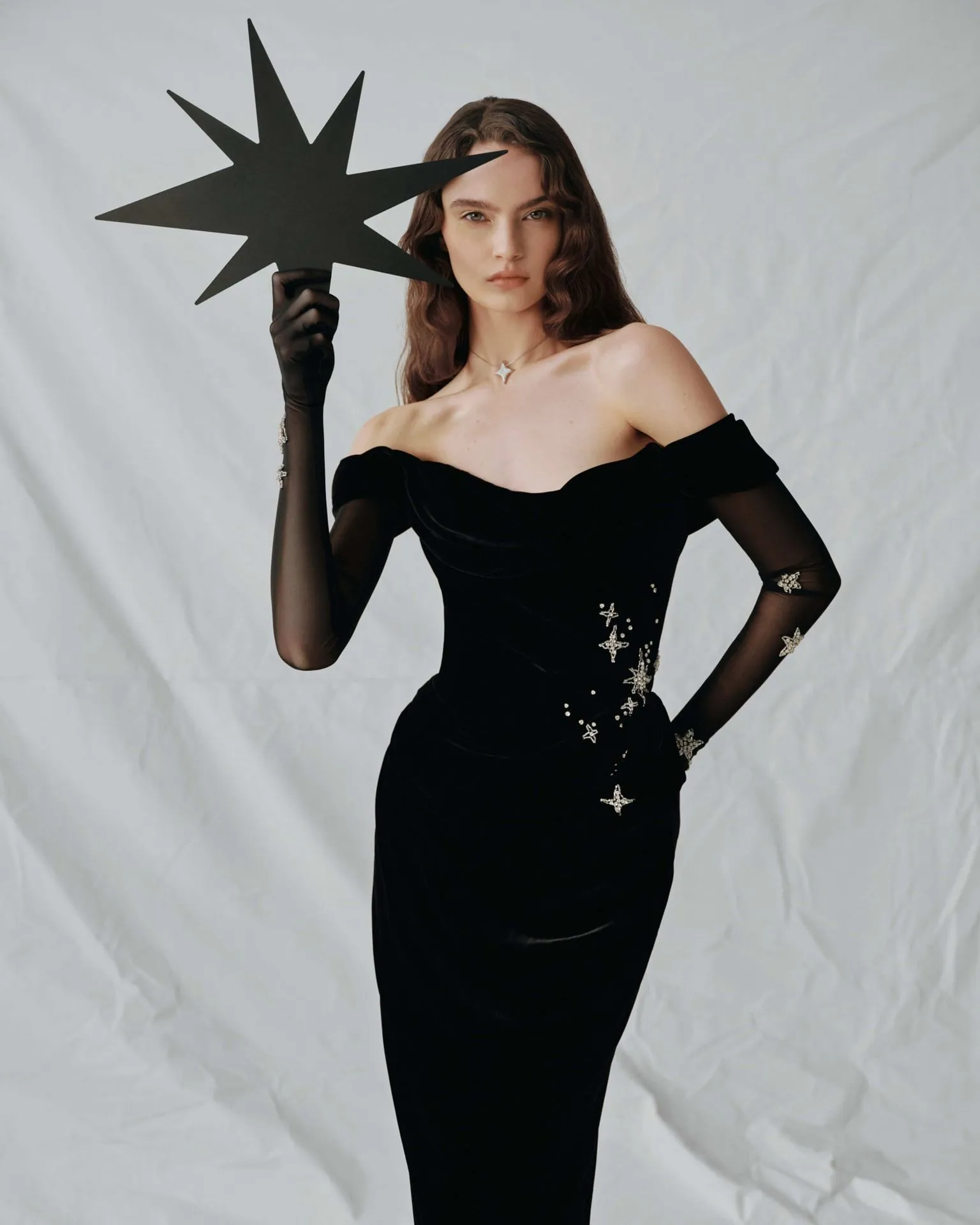 Long black tulle gloves reaching above the elbow, embellished with beading and sequins for a bold, dramatic finish.