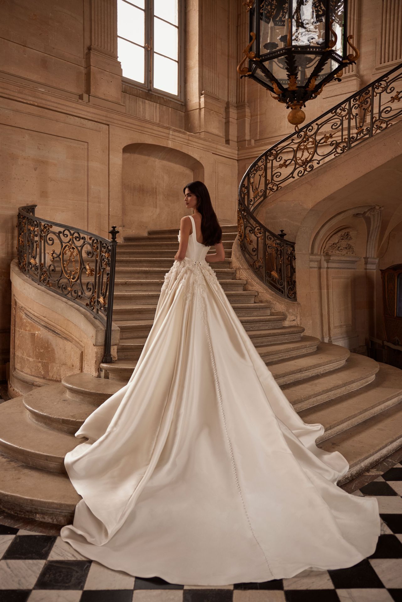 Regal detachable cathedral train fashioned from mikado fabric, embellished with exquisite floral lace appliques intricately hand-embroidered with sequins. Floral appliques cascade across the top of the skirt as the mikado gracefully descends, forming a chic train with buttons at the back and a petite embellished belt on the waist.