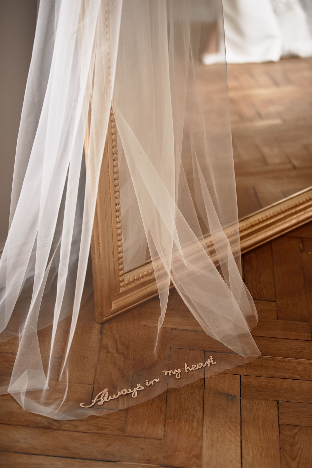 Gathered tulle veil decorated with delicate pink embroidery 'Always in my heart'.Length of the veil: 2.5 mWidth of the veil: 3 m
