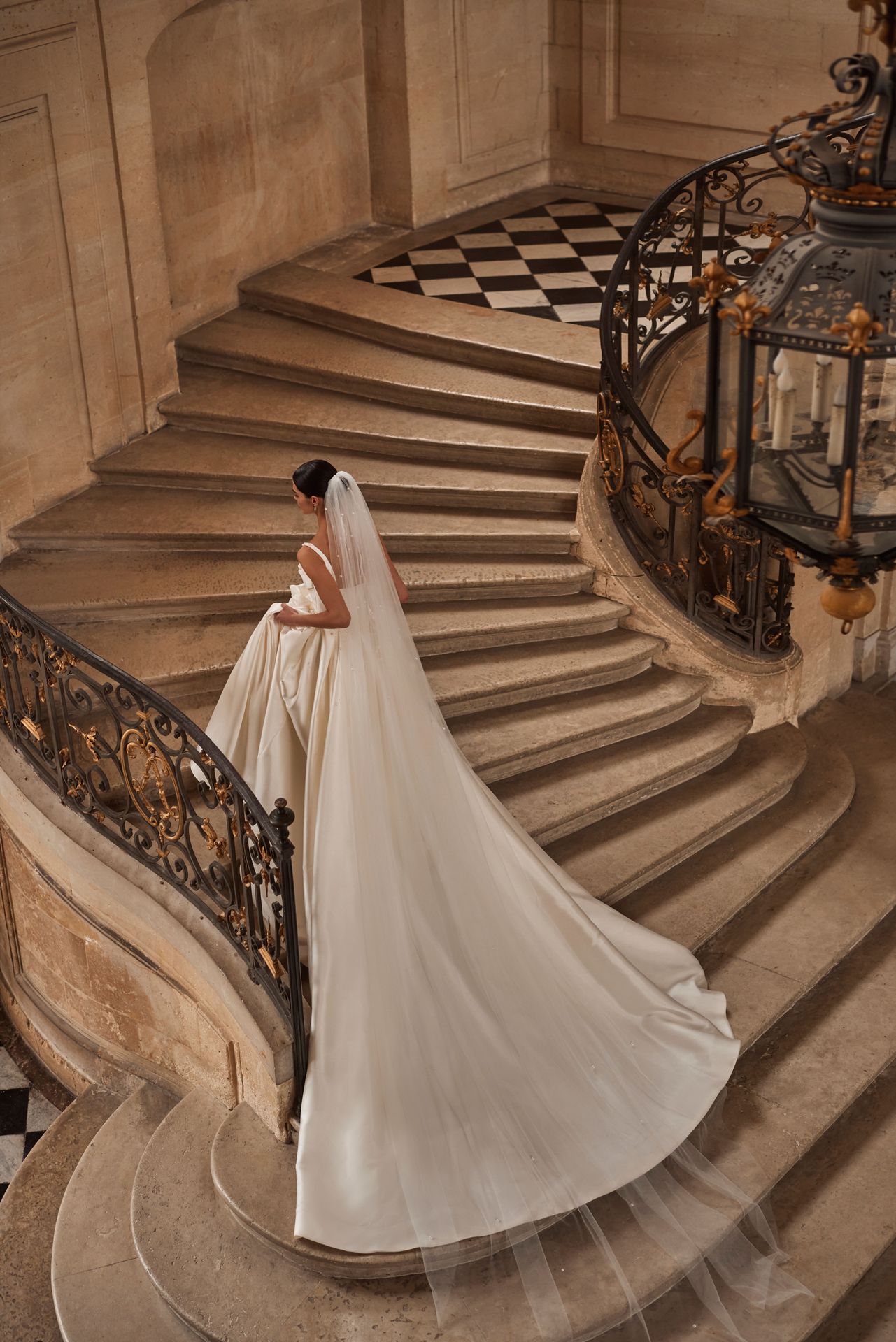 Magnificent cathedral veil, adorned by hand with delicate pearls and speckled with ostrich feathers cascading along the majestic train.
