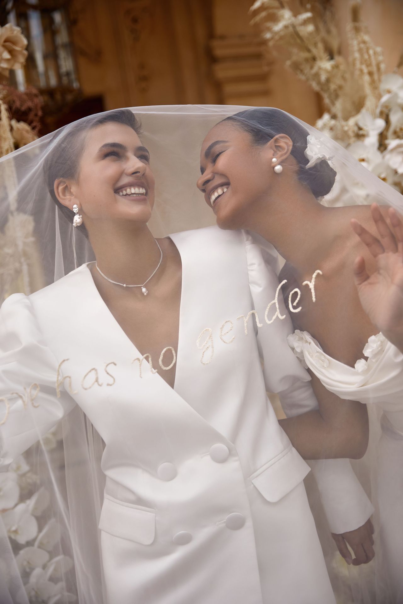 A statement minimalistic tulle veil with handmade embroidery 'Love has no gender'.Length of the veil: 3.5 mWidth of the veil: 2.5 m