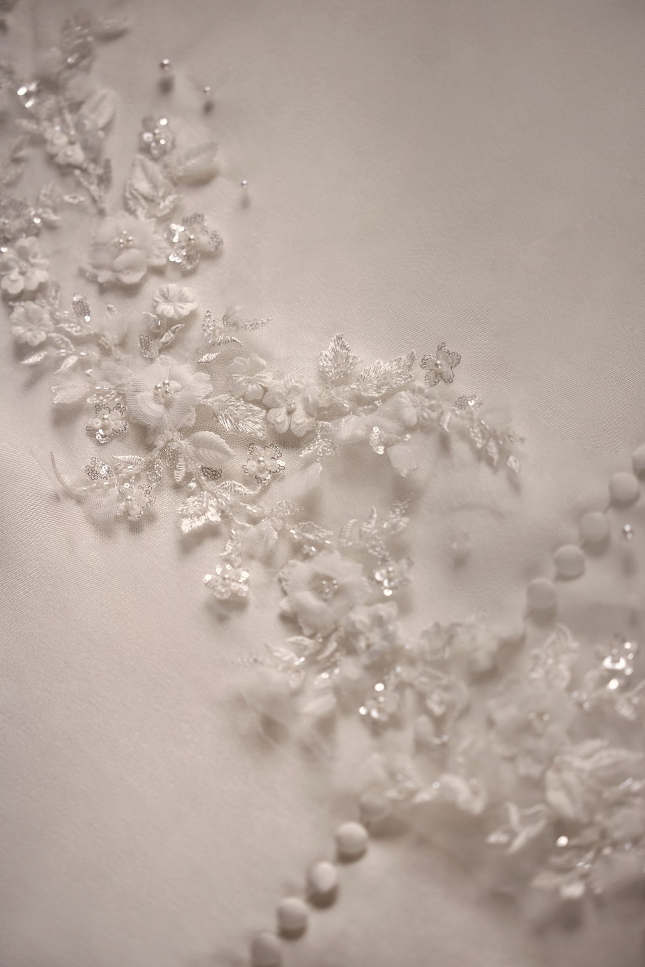 Dreamy cathedral tulle veil adorned by hand with 3D floral embroidery and pearls along the edges of the veil.