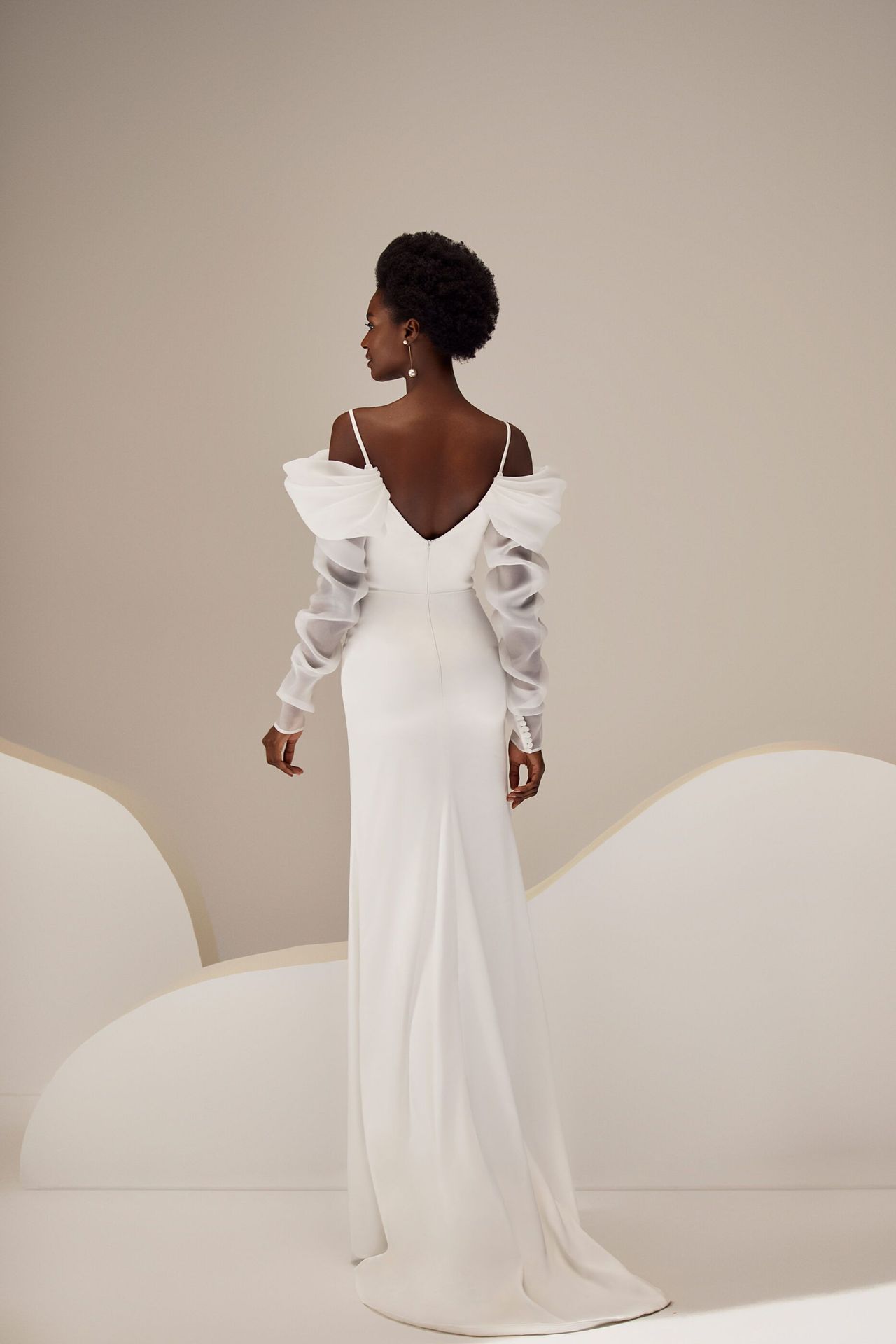 Mermaid off‐the‐shoulder wedding dress in ivory color with detachable organza sleeves.