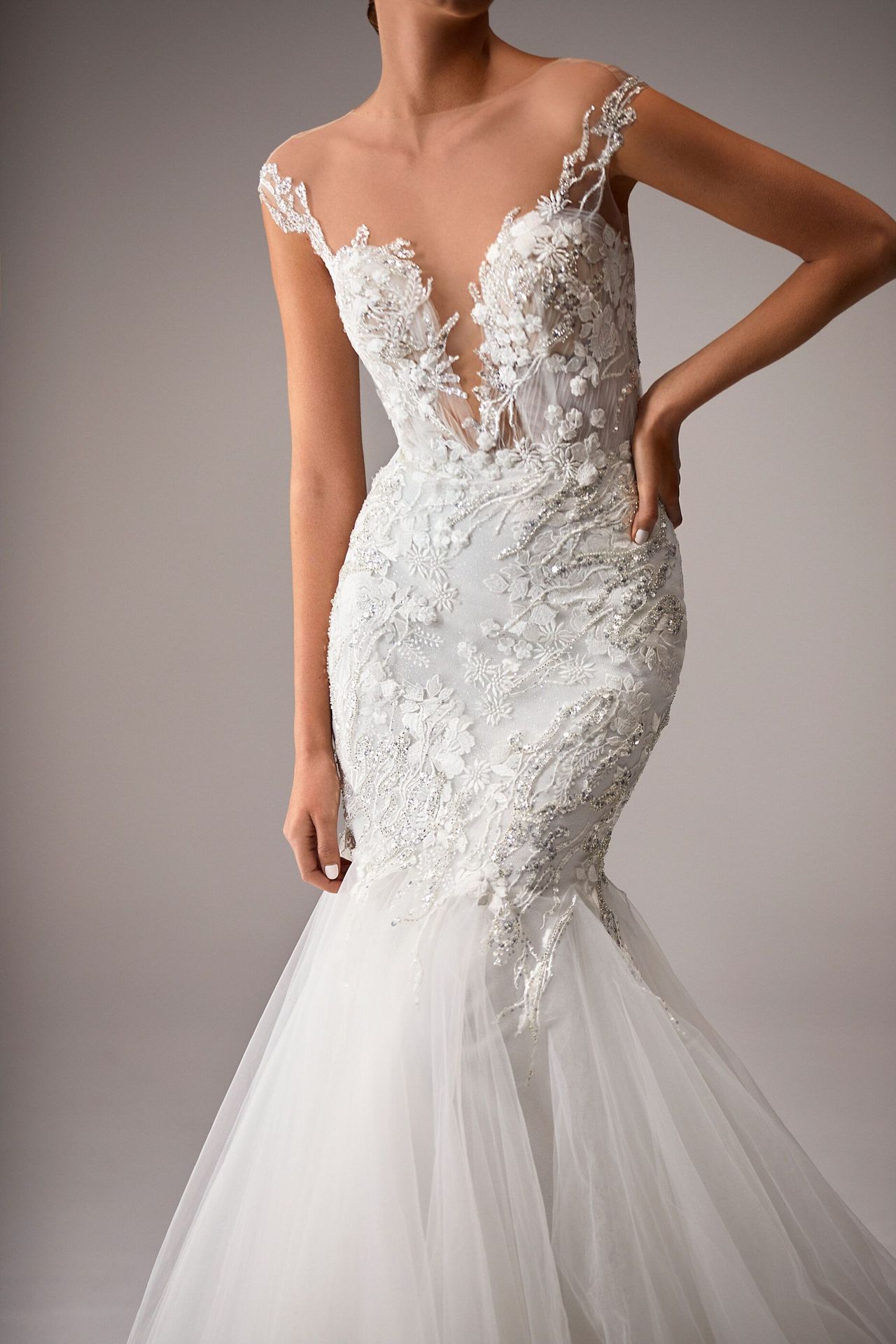 Mermaid wedding dress decorated with lace and beading, flared tulle bottom and a long train.