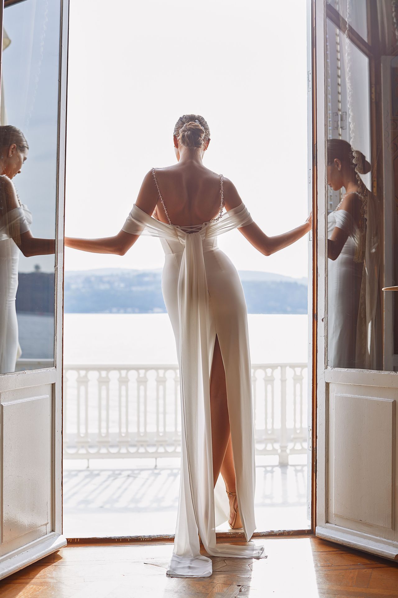 Elegant off-the-shoulder sheath wedding dress in white. Features crystal beaded straps, sheer bow back, and a high back slit