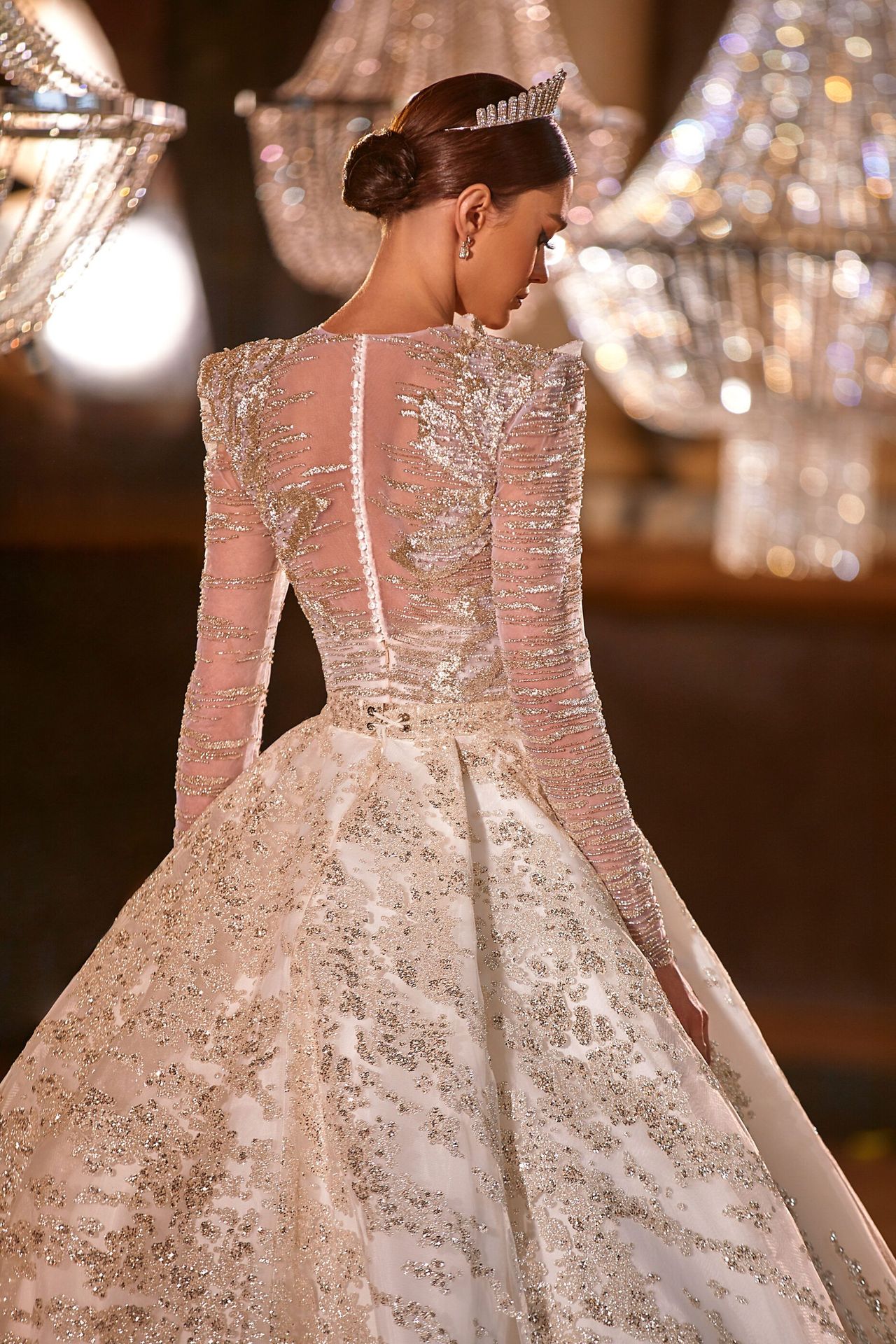 Fully embellished royal ballgown wedding dress in ivory. Features a long-sleeved semi-transparent bodice, fully adorned bodice and skirt, button back, and a long garnished train.