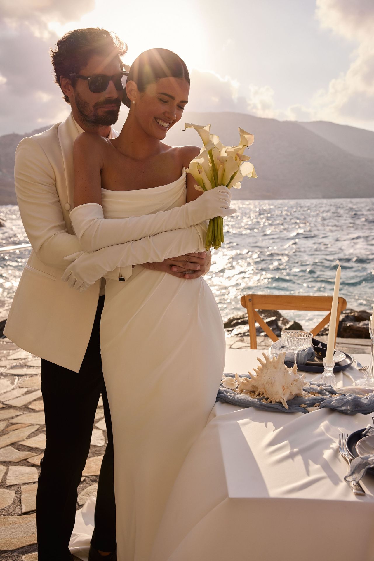 Artfully draped straight gown crafted from airy chiffon. Featuring a structured sharp hand-draped strapless corset with zip closure at the back, and a fitted maxi skirt with a midi train and asymmetrical draping alongside the whole lengths that contour the body beautifully. Can be complimented by a satin braided headband Amelise or a exquisite hairband Amelise adorned with pearls, with a calla lily as a centerpiece.