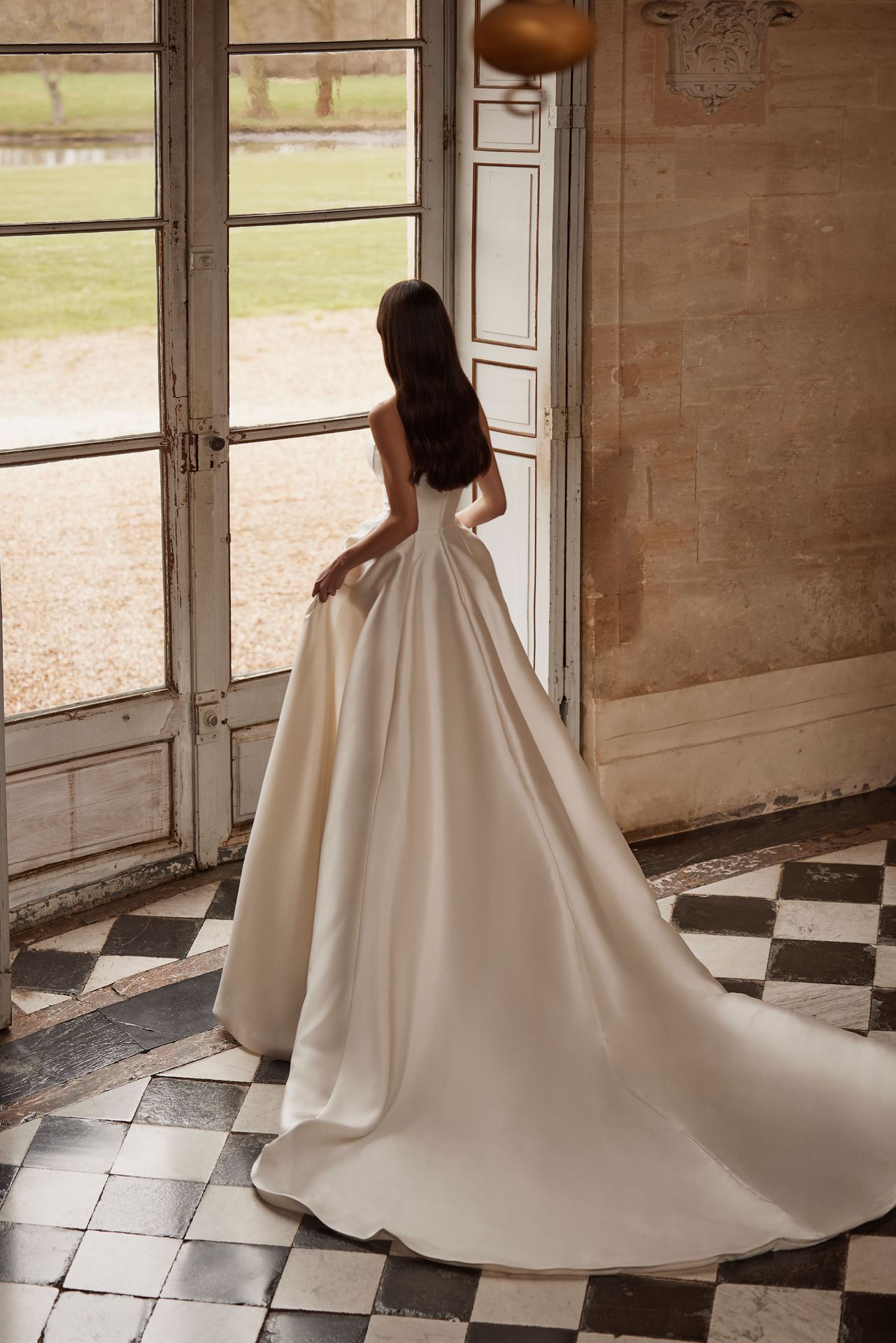 Sophisticated A-line wedding gown fashioned from mikado. Featuring a boned corset with a heart-shaped neckline, zip-up closure on the back, and a lush voluminous skirt with a midi train.
