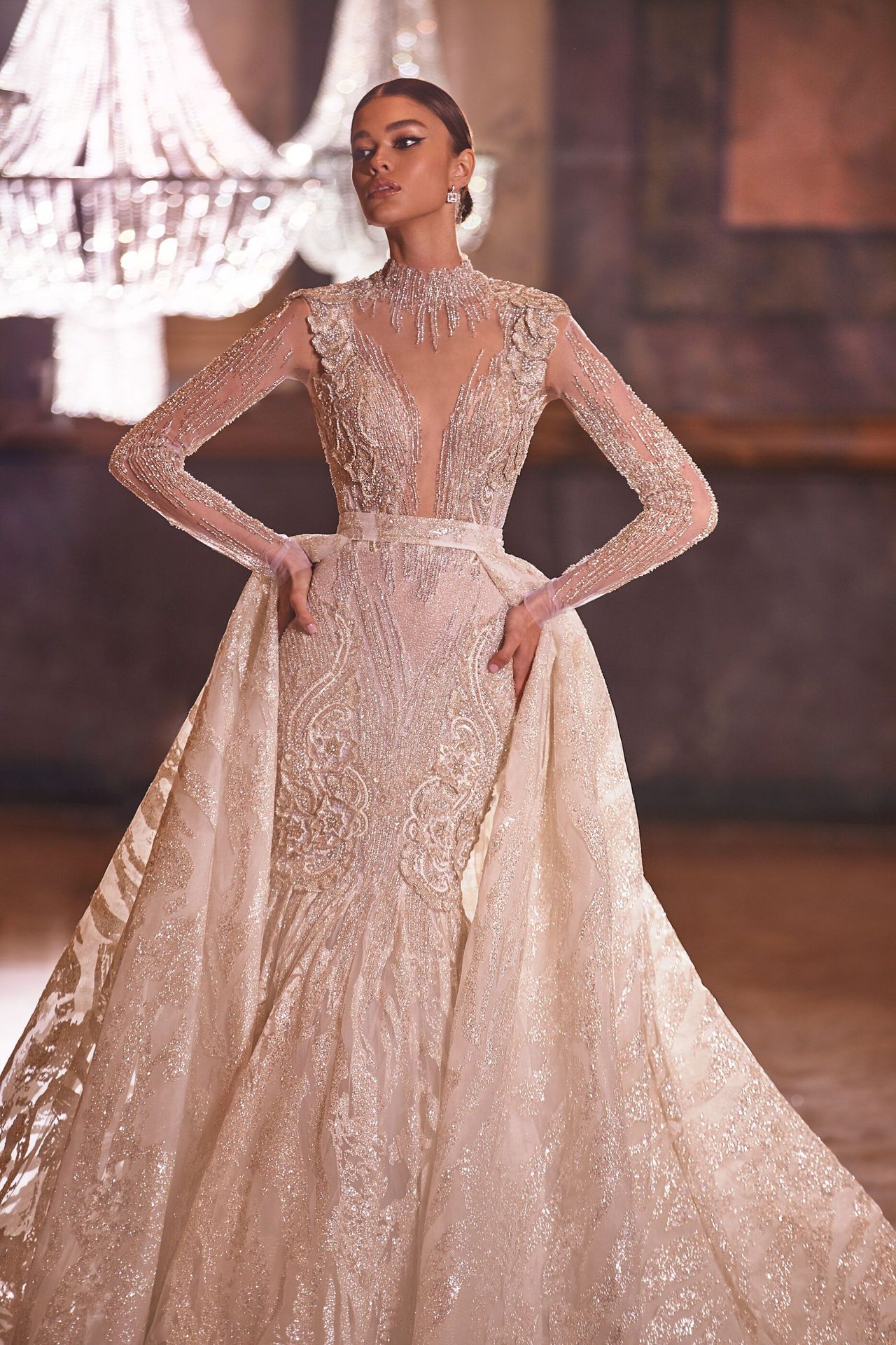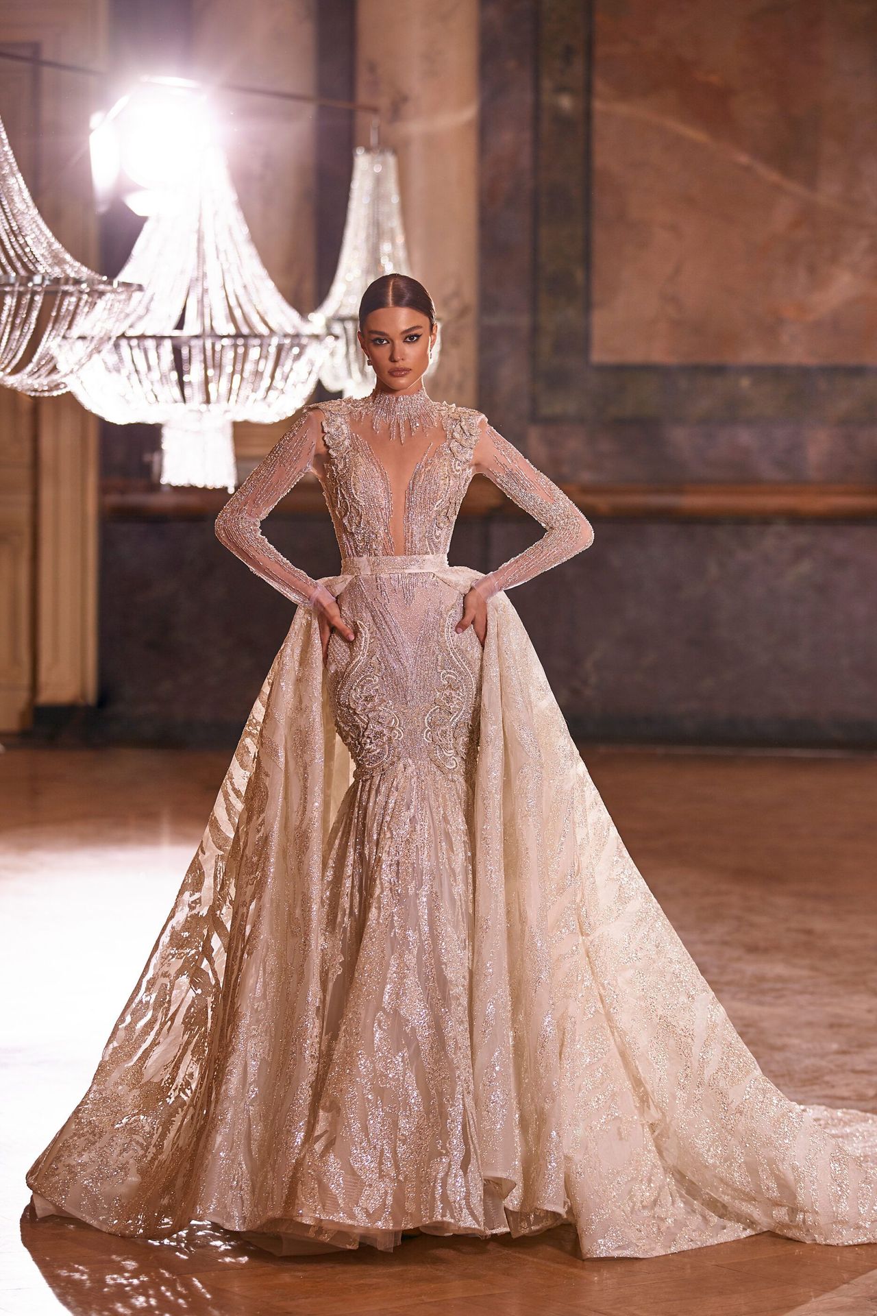 Fully beaded royal mermaid wedding gown in ivory with gold embellishments.Features a plunging neckline, semi-transparent bodice, long beaded sleeves, and an open button back. Complemented with a sparkly full detachable overskirt.
