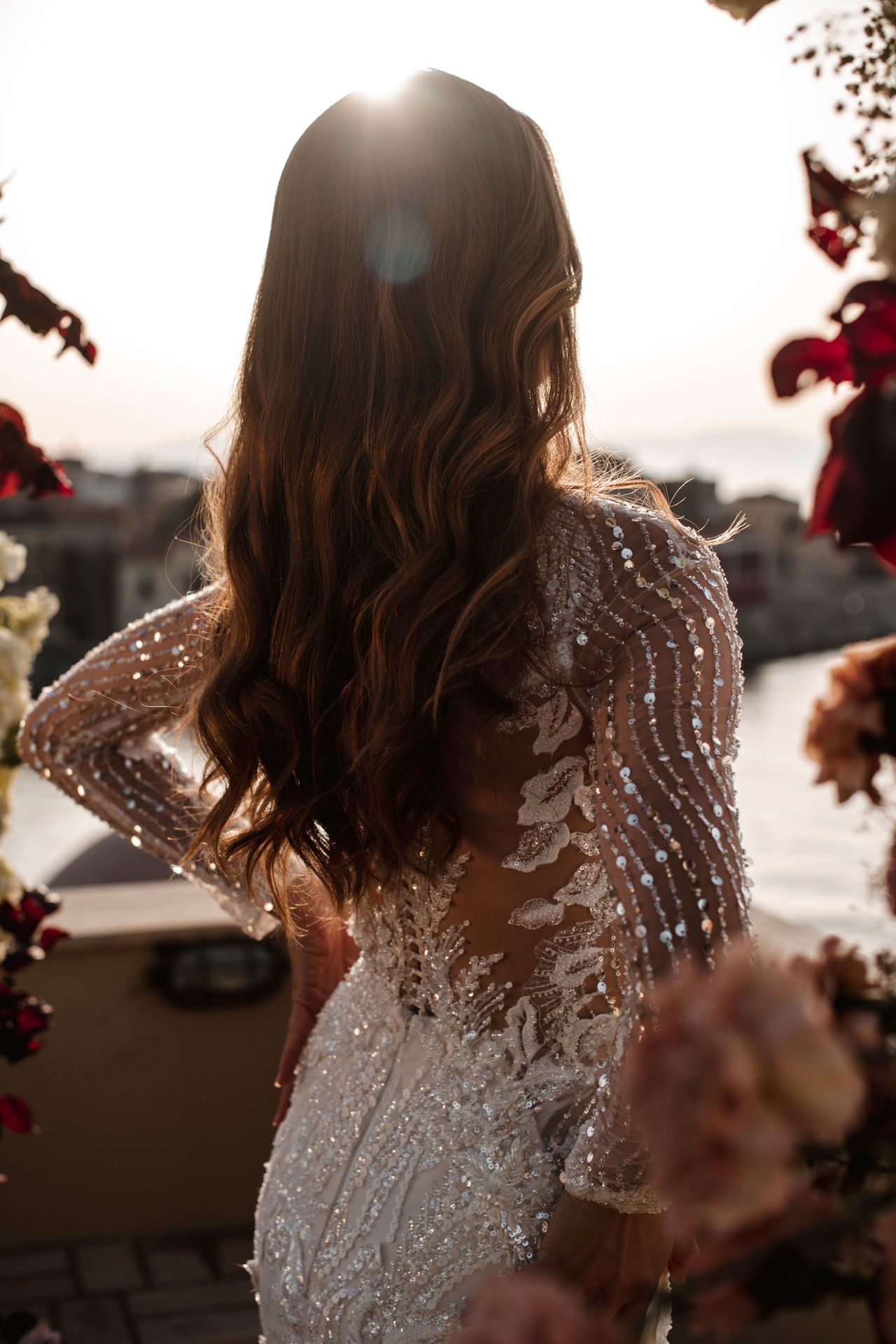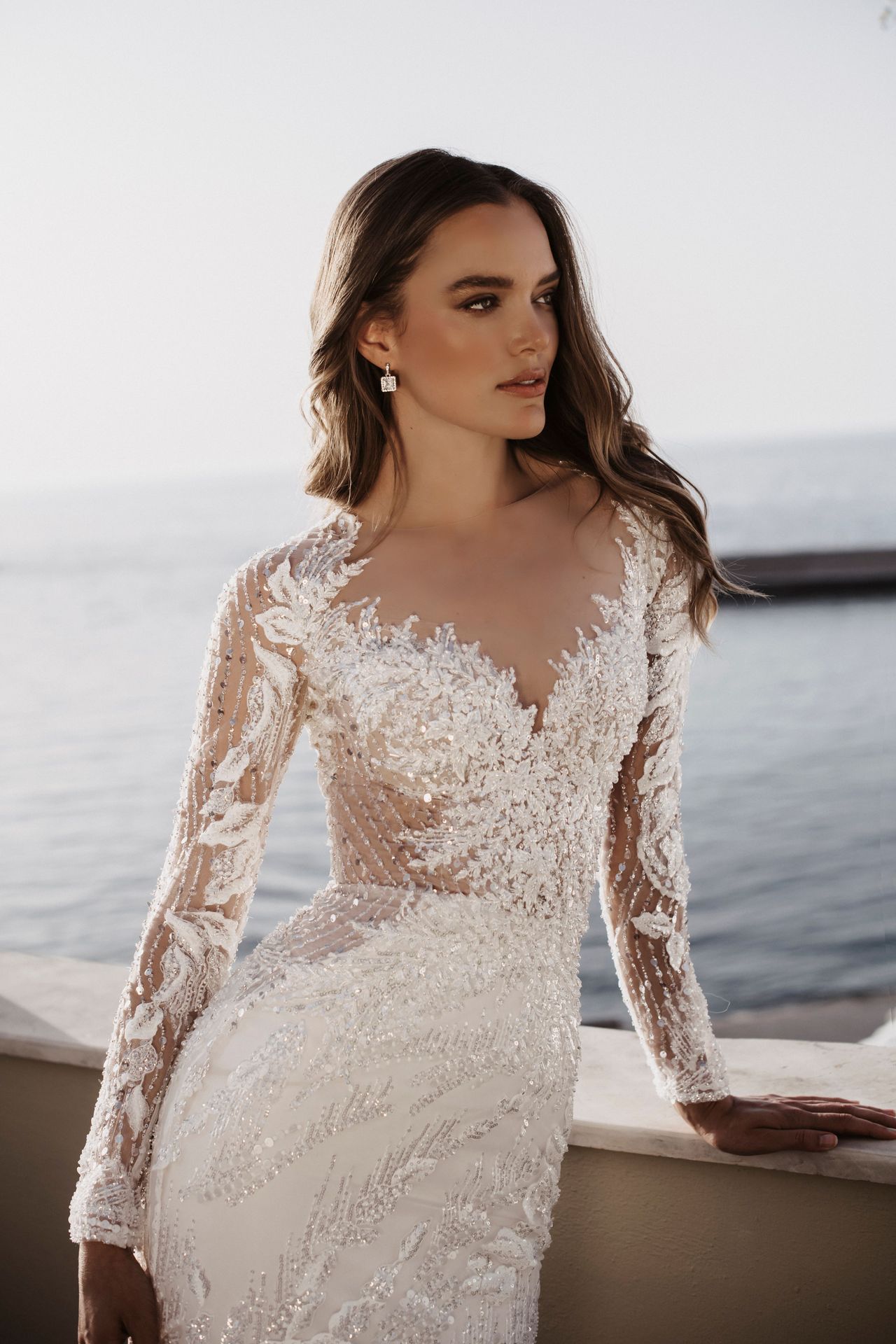 Sparkly long-sleeved sheath wedding dress in ivory. Features a heart-shaped neckline, fully beaded semi-transparent sleeves, fitted semi-transparent bodice with an open back, and an embellished skirt with a long train.