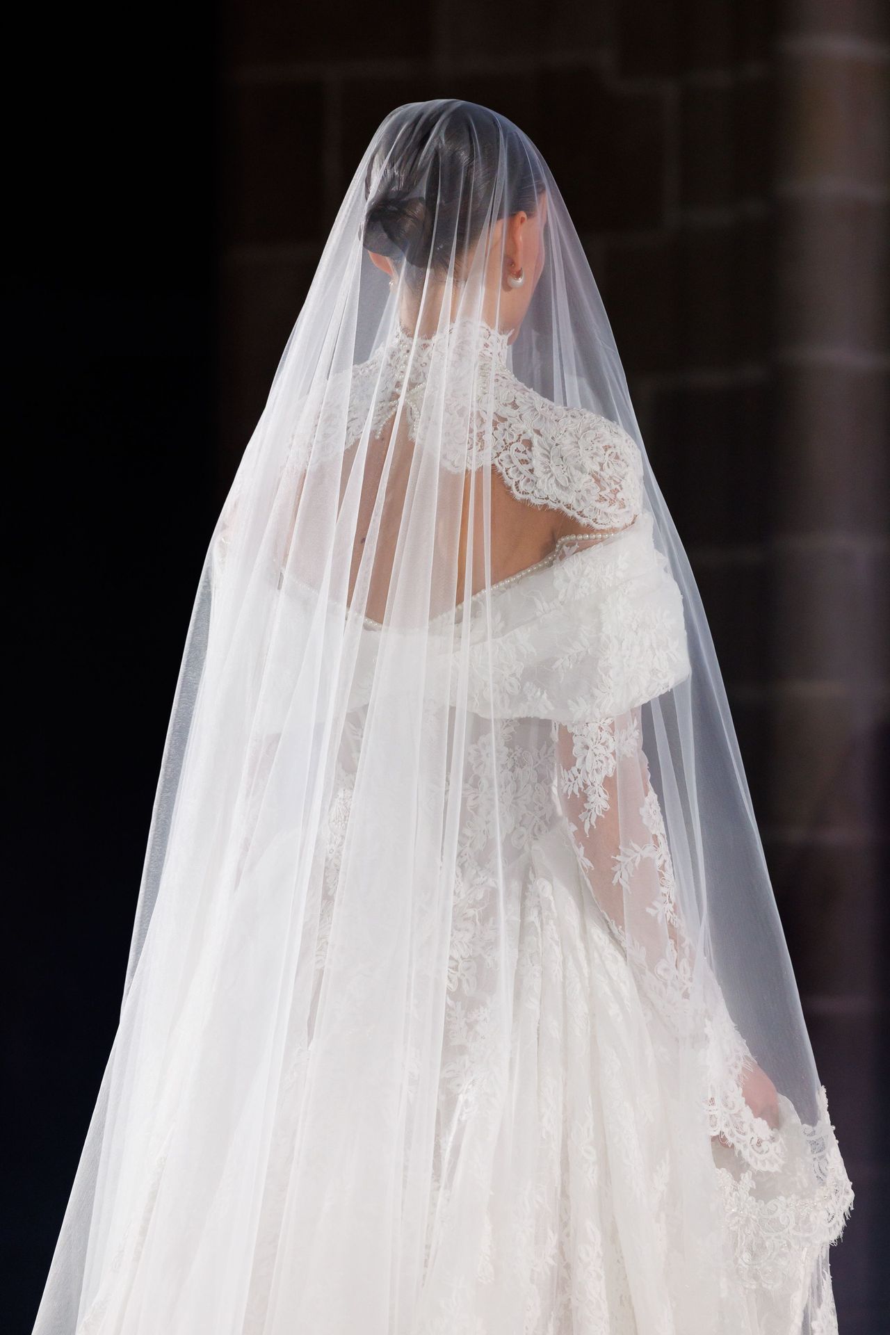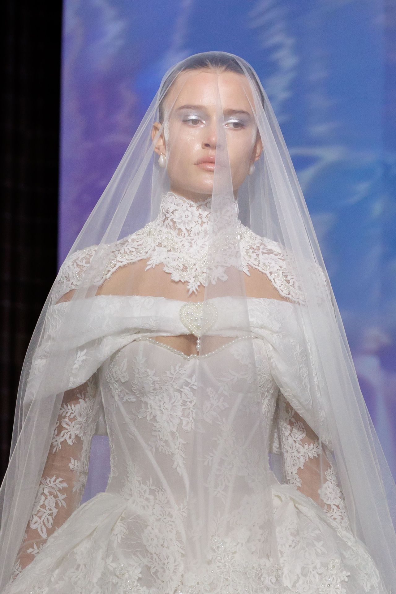 Majestic off-the-shoulder long sleeved princess wedding gown crafted from a delicate combination of lace and tulle. Featuring a heart-shaped sharp drop-waist V-corset, long off-the-shoulder semi-transparent lace sleeves, and a lace-up closure on the back that is accompanied by a vintage-inspired detachable off-the-shoulder bolero with a volumetric bow and a romantic chocker adorned with exquisite hand embroidery along the decolletage, shoulders, and neck. The voluminous lace skirt is elevated by hidden puff shorts, creating dramatic volume around the hips for a royal effect.