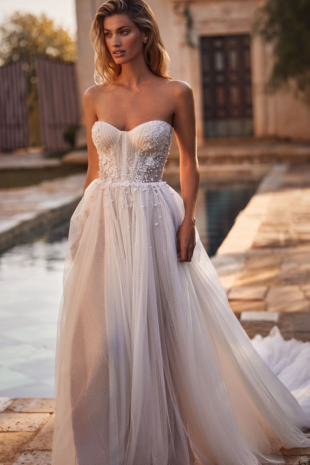 Dreamy A-line wedding gown crafted from lightweight draped mesh tulle fabric, hand-embellished with 3D lace flowers and pearls. Featuring a heart-shaped semi-transparent corset intricately decorated with 3D flowers and pearls cascading from the bodice to the top of the skirt, a closed embellished semi-transparent back on a zipline, and a flowy maxi skirt with a midi train.