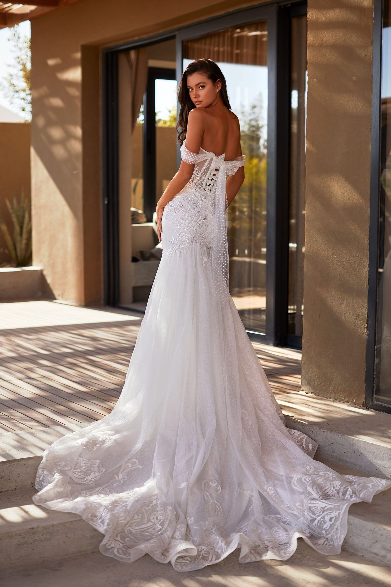 Mermaid silhouette, off-the-shoulder wedding gown in ivory. Features beaded semi-transparent bodice, beaded skirt, lace-appliques tulle train, and a lace-up bowknot open back.