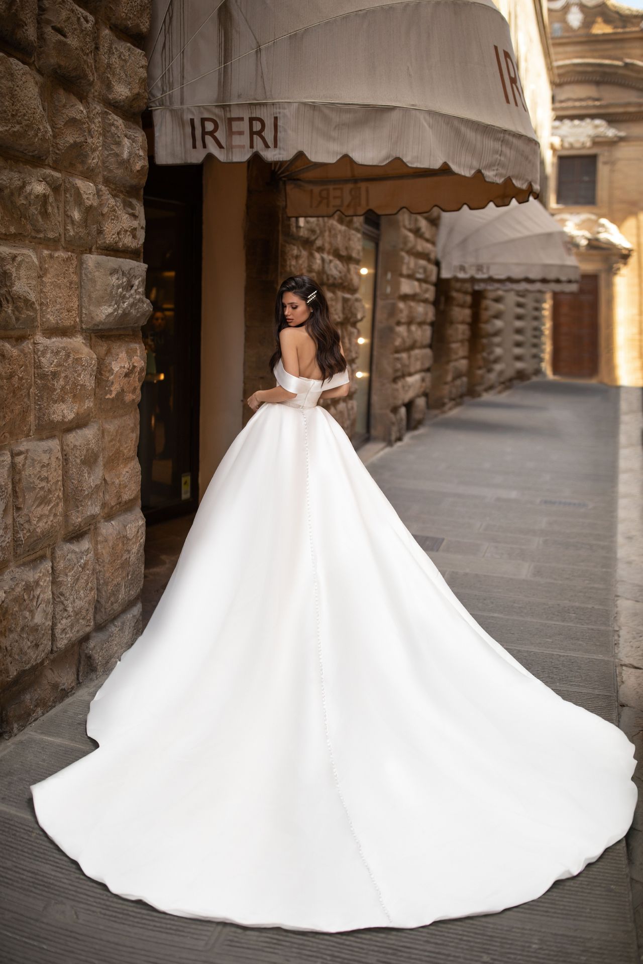 Cinderella off-the-shoulder satin wedding ball gown with a front slit on the neckline and a long cathedral train.