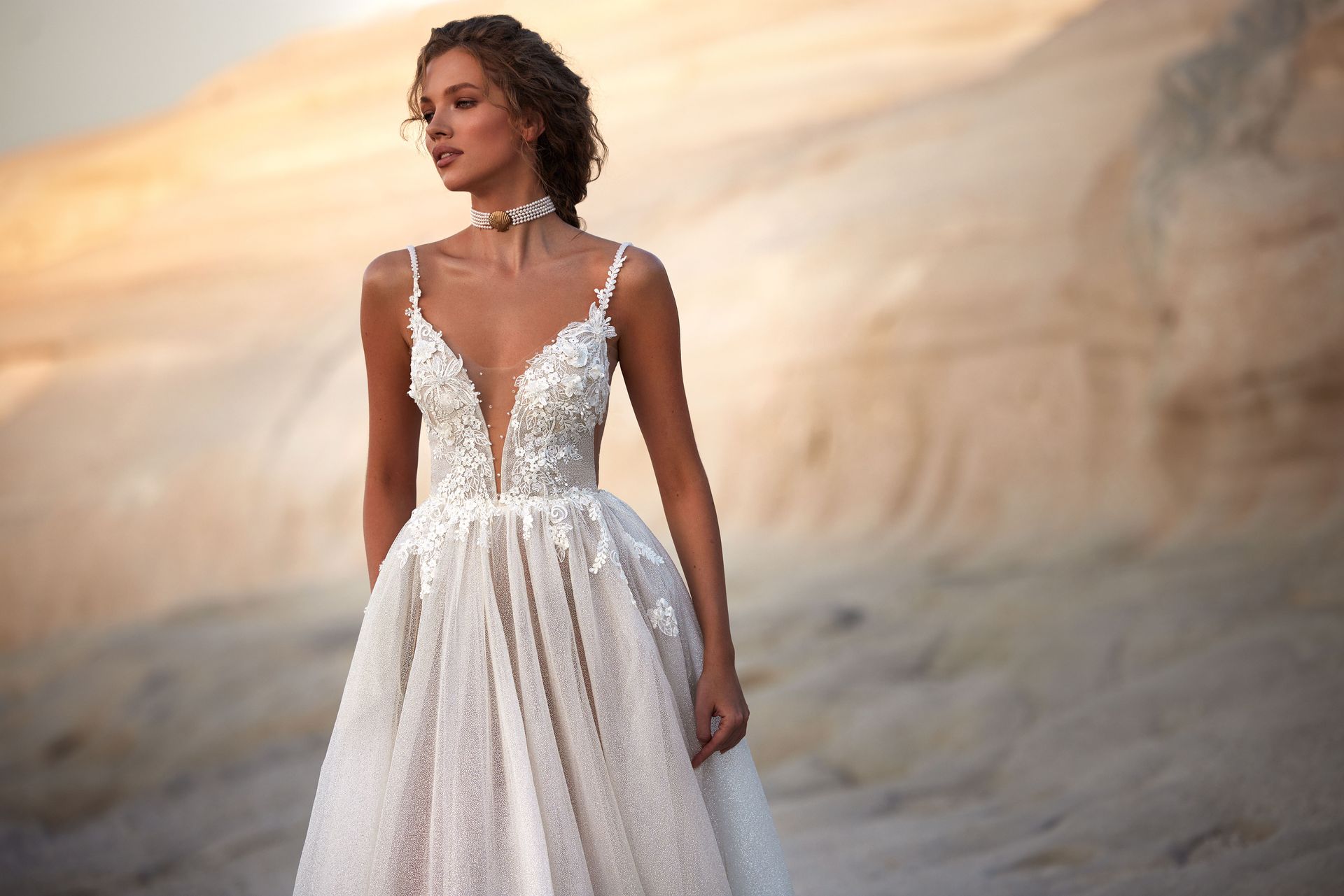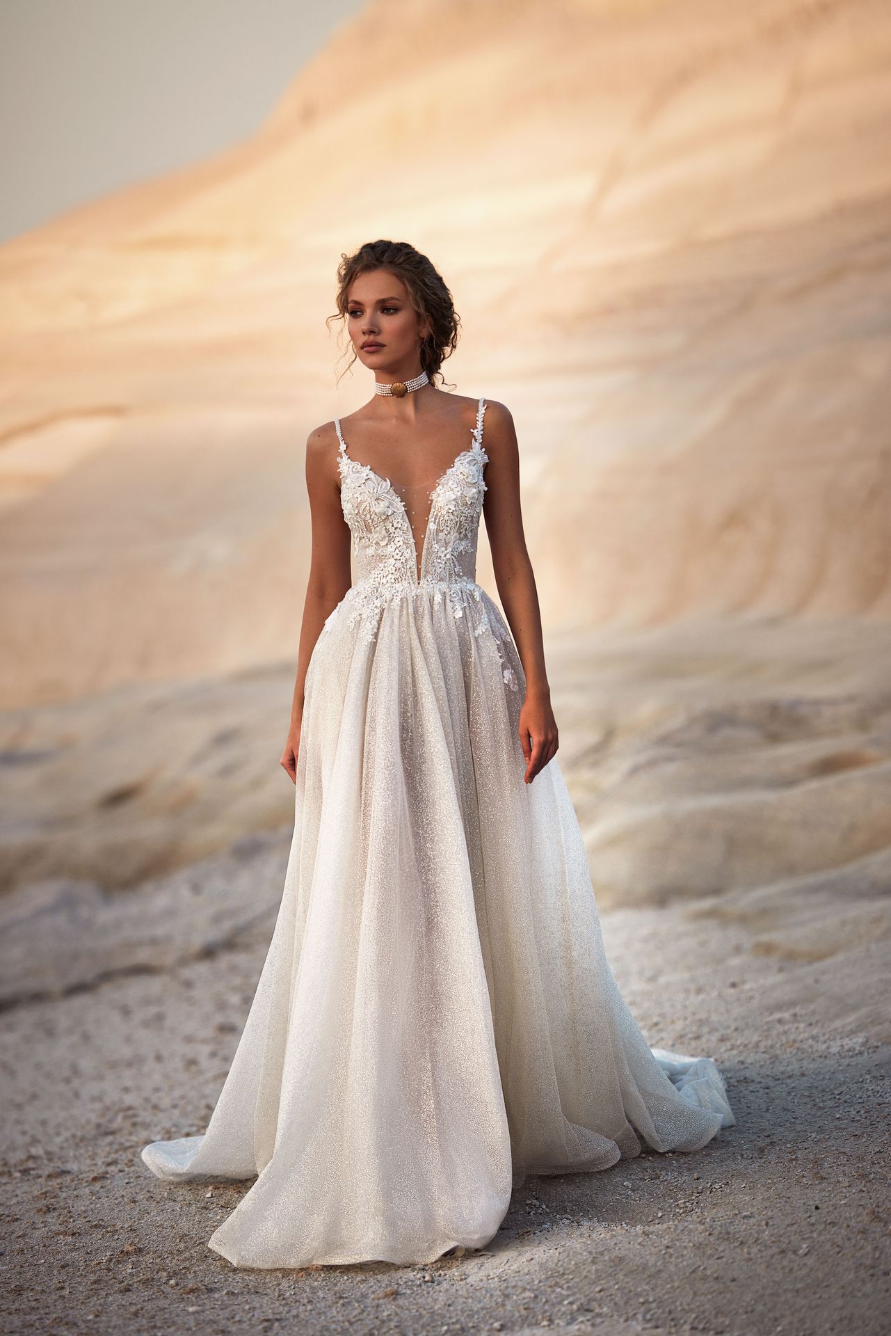 Sparkly A-line wedding gown on spaghetti straps. Featuring a plunging V-neckline, 4D floral applique on the bodice, V-back, and midi train.