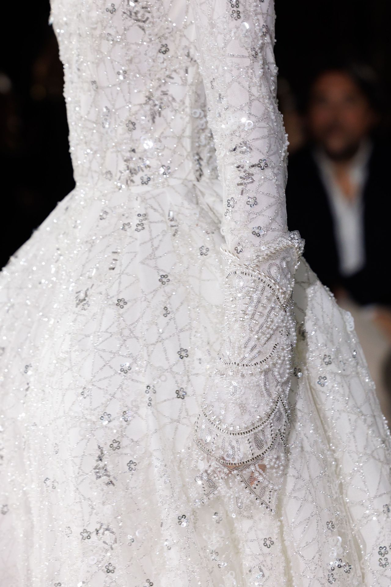 Statement royal wedding gown fully embellished by hand with a bounty of crystals, beadings, and sequins. Featuring a fully adorned by hand turtleneck bodice with embellished long sleeves, square shoulders, and an extremely voluminous skirt. The corset is doubled, with an additional shaping detachable corset sewn within. The gown is also enhanced by removable puff shorts that, similar to a petticoat, add volume to the skirt, creating a dramatic and sculptural silhouette. Crafted from luxurious lace lined with a stretchy, silky underlayer, this gown offers an exquisite balance of comfort and grandeur. Can be complemented with matching, fully embellished by hand with beads, pearls, and sequins, exquisite Auvielle cuffs and Auvielle necklace for an added touch of regalness.