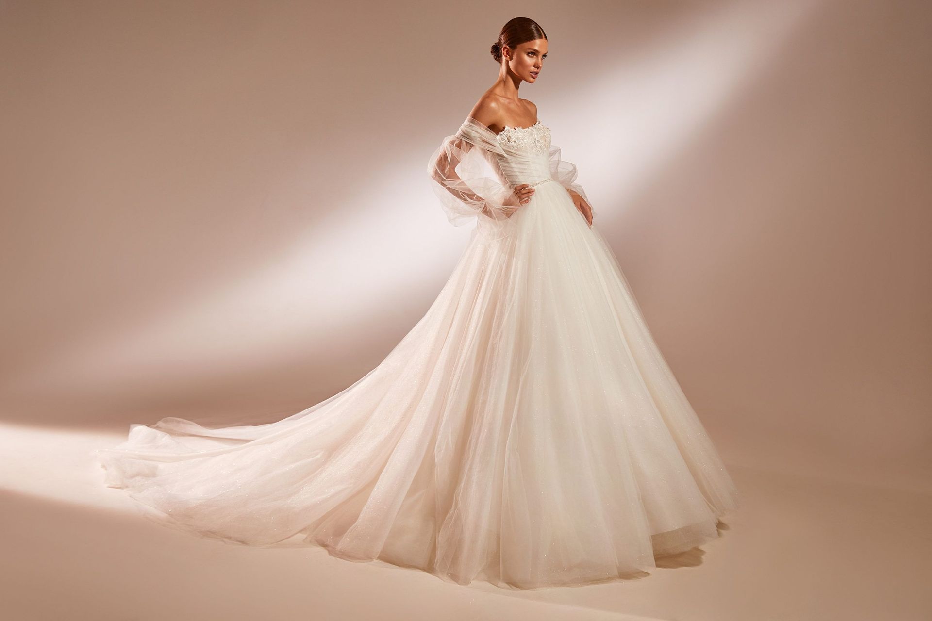 Sparkly ball gown with a semi-transparent tulle off-the-shoulder long sleeves, flower applique on the corset, sequin waistband, and a fluffy maxi skirt with a long train.