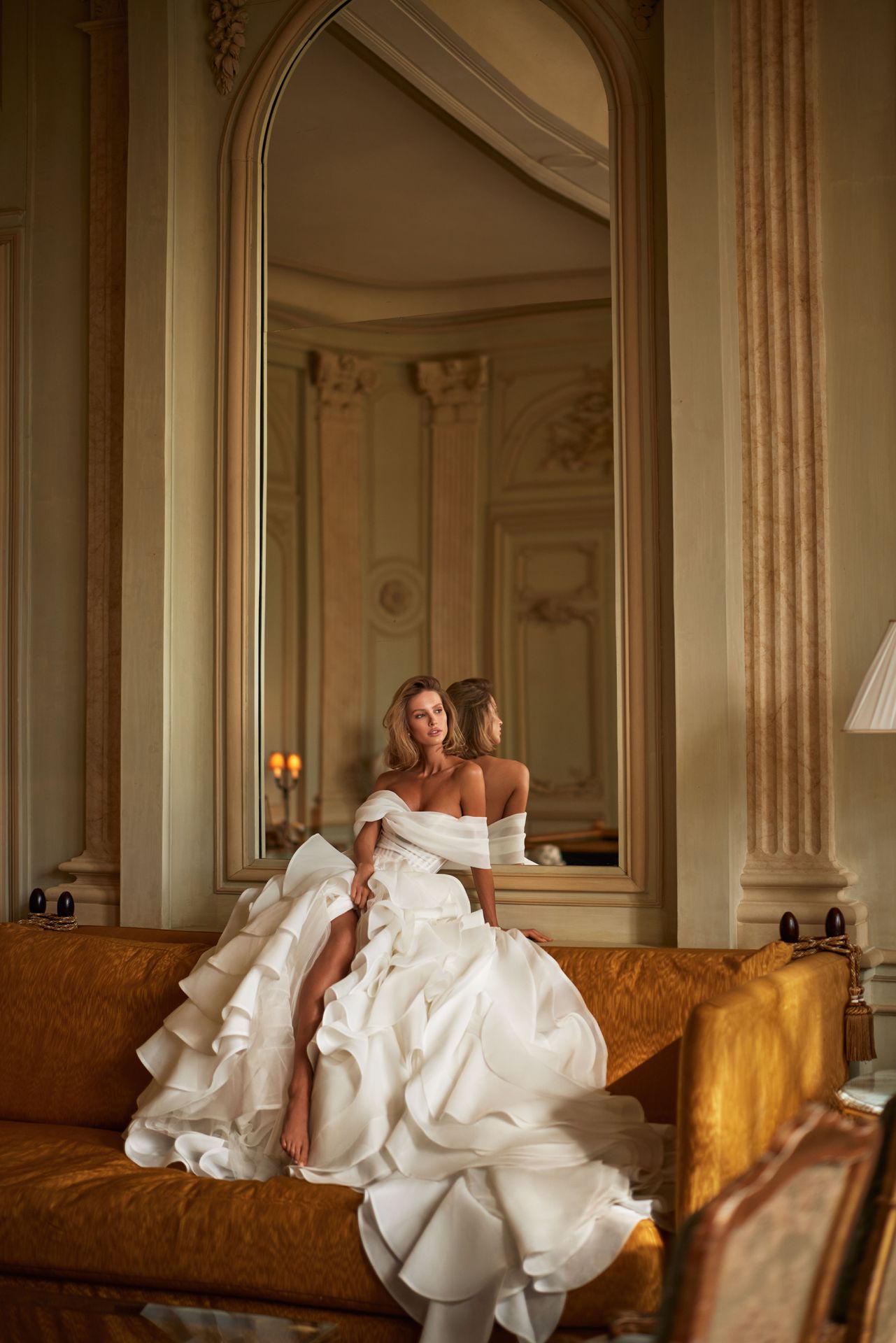 Fashionosta-worthy organza gown with whimsical frills. Featuring a heart-shaped bow-shaped off-the-shoulder bodice with a bow on the back, and an opulent voluminous maxi skirt made from dozens of organza layers each handcrafted into exquisite frills that dance and sway in captivating harmony with every movement.