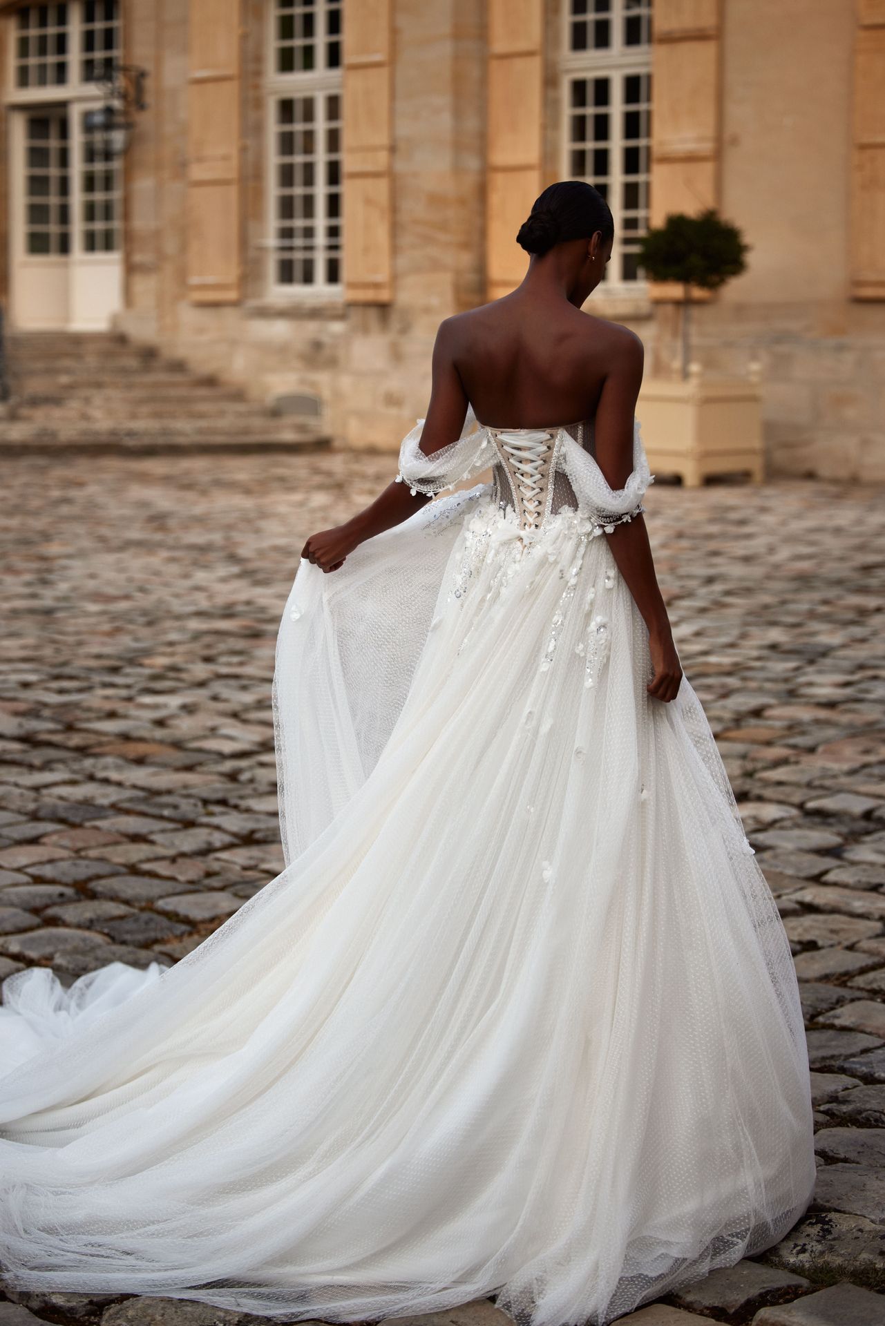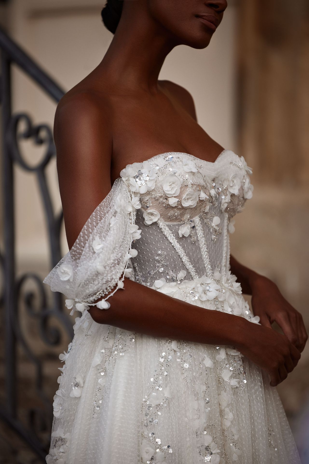 Dreamy A-line wedding gown in vintage-esque polka dot fabric adorned with 3D flowers and sequins. Featuring a sweetheart semi-transparent corset, off-the-shoulder lace sleeves embellished with 3D flowers, lace-up closure on the back, and a full tulle skirt with a train.