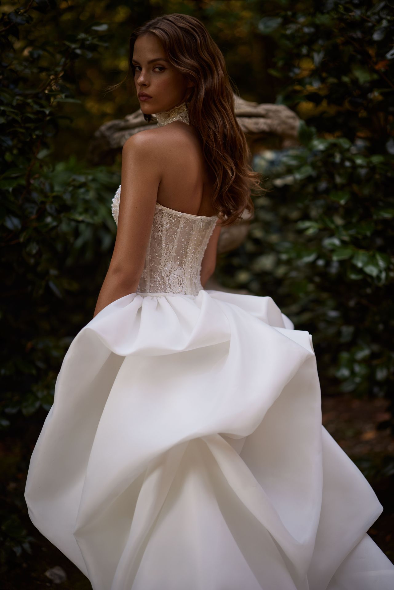 Refined mermaid gown crafted from delicate lace adorned with delicate pearls. The fitted drop waist bodice is designed in a corset style with structured visible boning, a U-shape neckline with a built-in cup, and a sewn-i n shaping corset that beautifully accentuates the figure. A flowing mermaid skirt cascades into a delicate train, adding movement and grace. Can be complemented with a detachable overskirt train Belen.