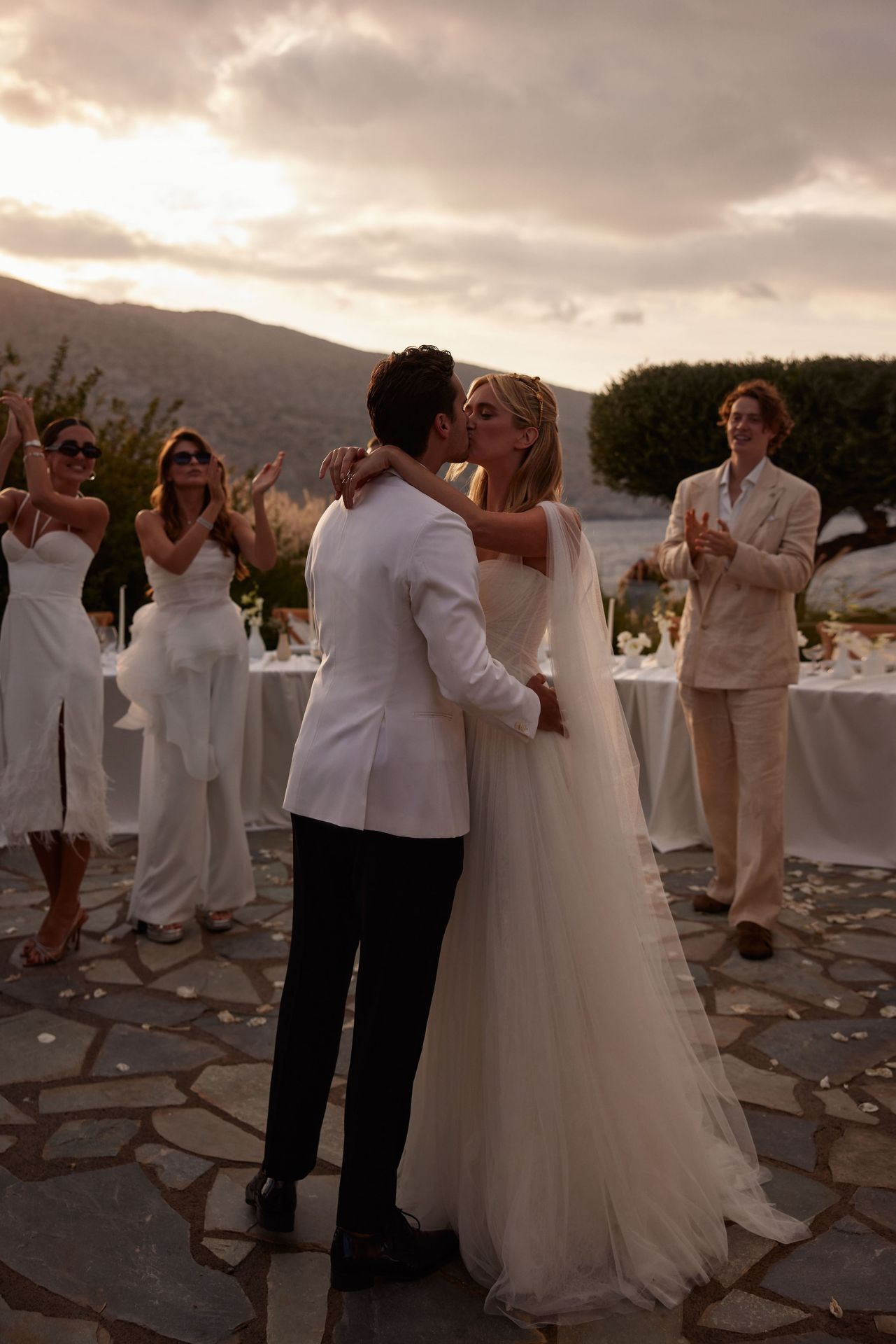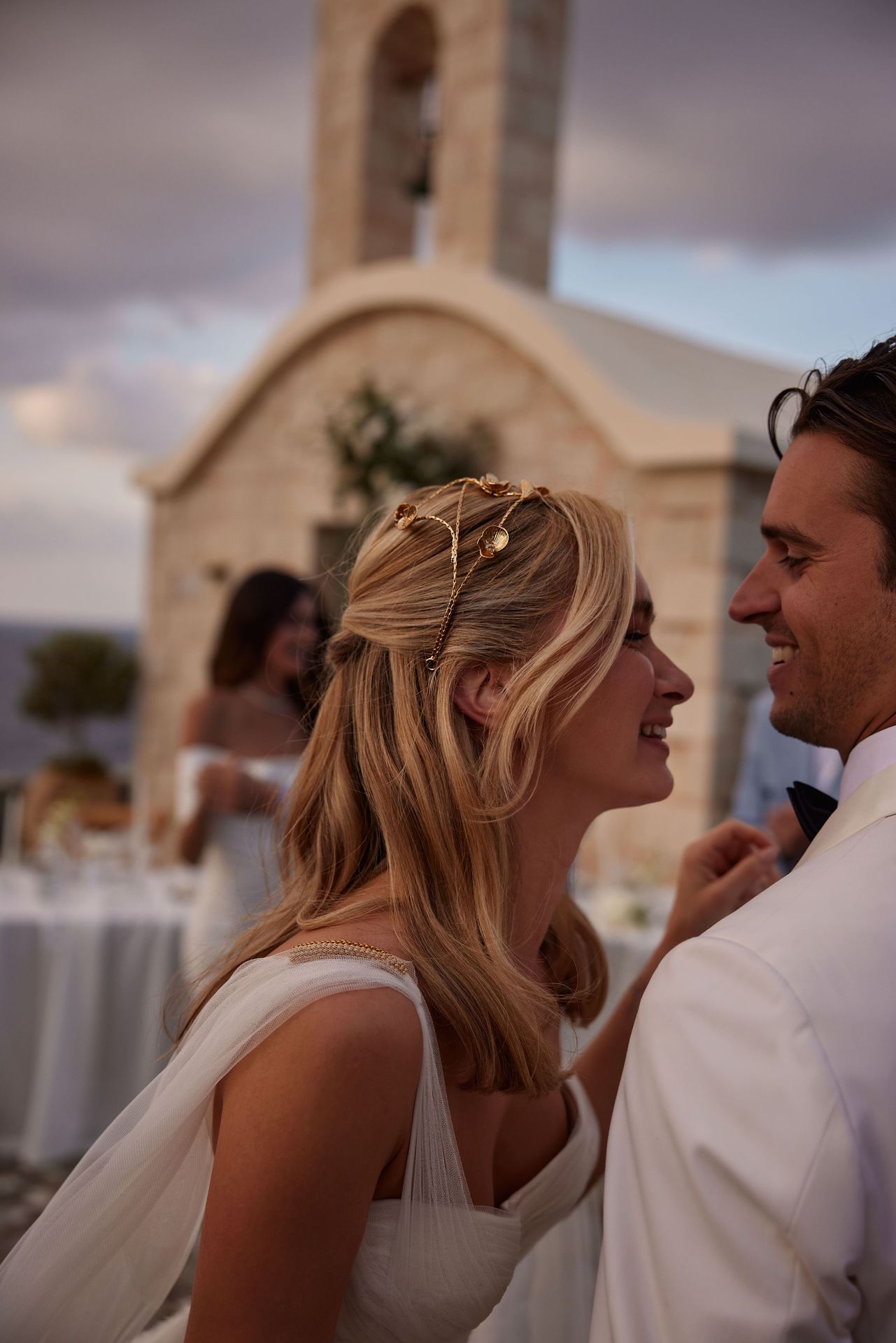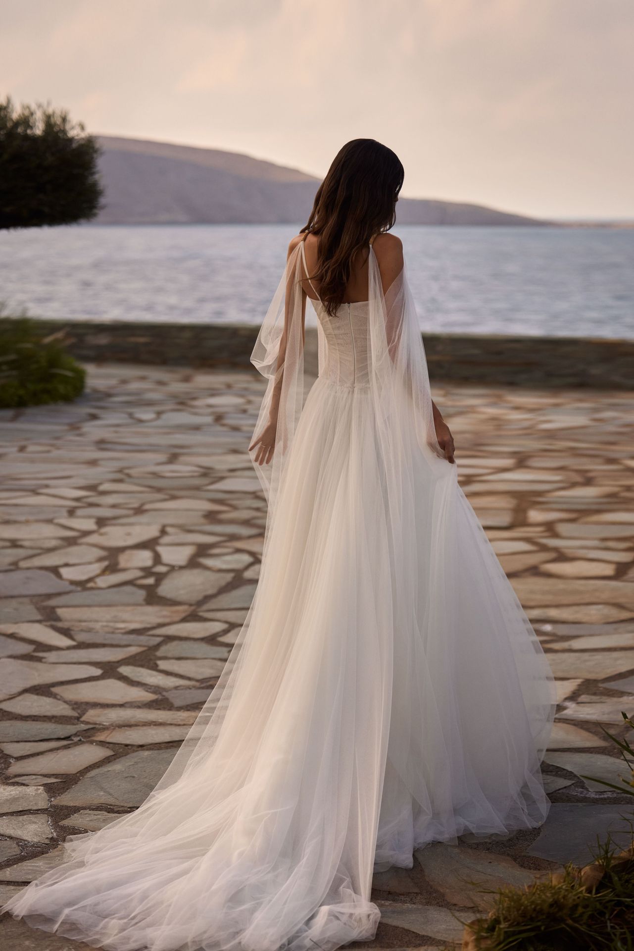 Ethereal A-line wedding gown crafted from airy tulle. Featuring thin straps that flow into tulle wings resembling Greek goddess attire. The heart-shaped bodice with built-in cups is artfully draped creating interwoven textured patterns. The sleek closed back with a hidden zipper provides a secure fit, while the layered tulle skirt ends in a soft s short rain.