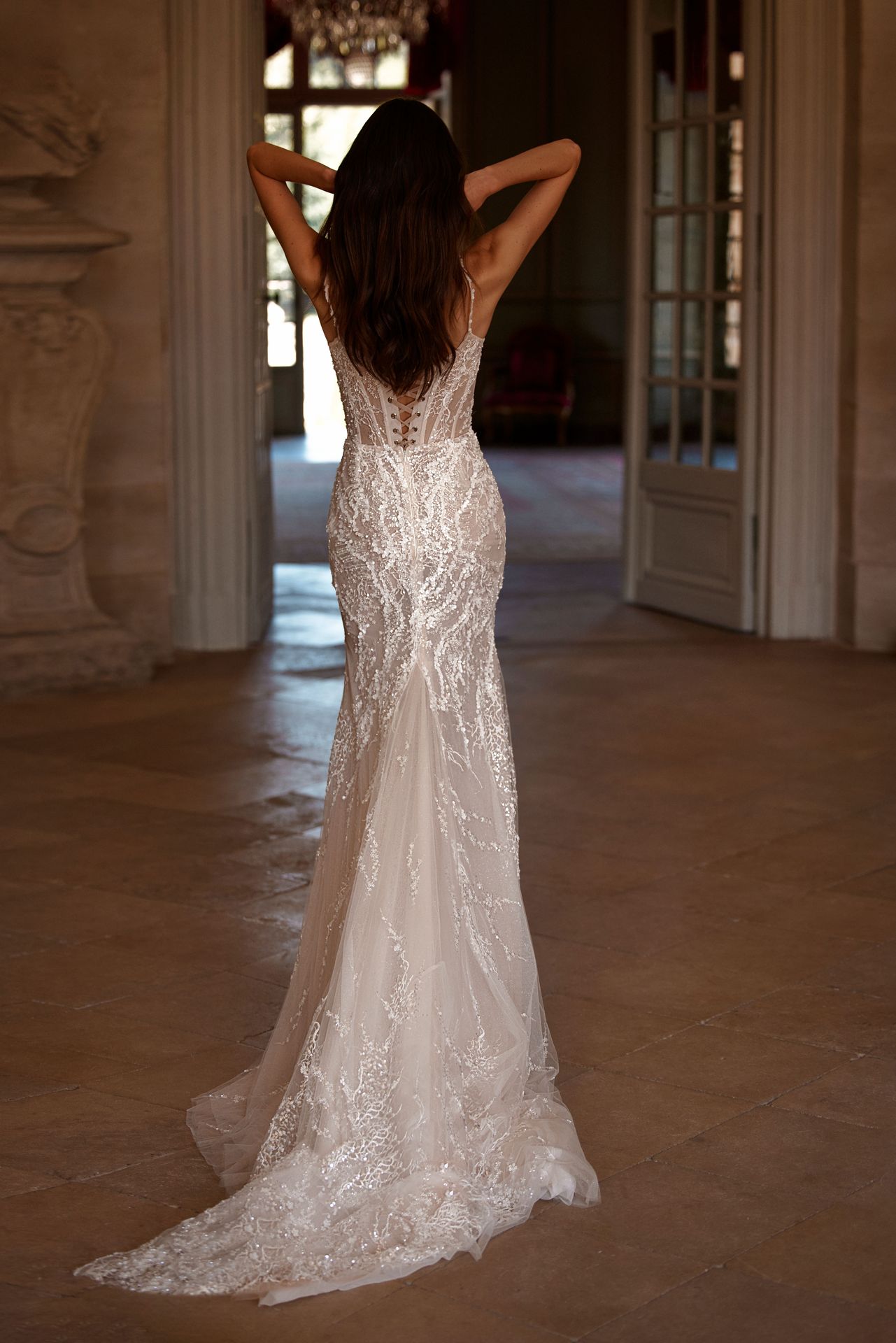Romantic sheath sparkling semi-transparent wedding gown on sequined straps. The gown is embellished with a tender sequined floral pattern, a sweetheart corset with lace-up closure on the back, a midi train, and a wrapped skirt with a daring front slit.