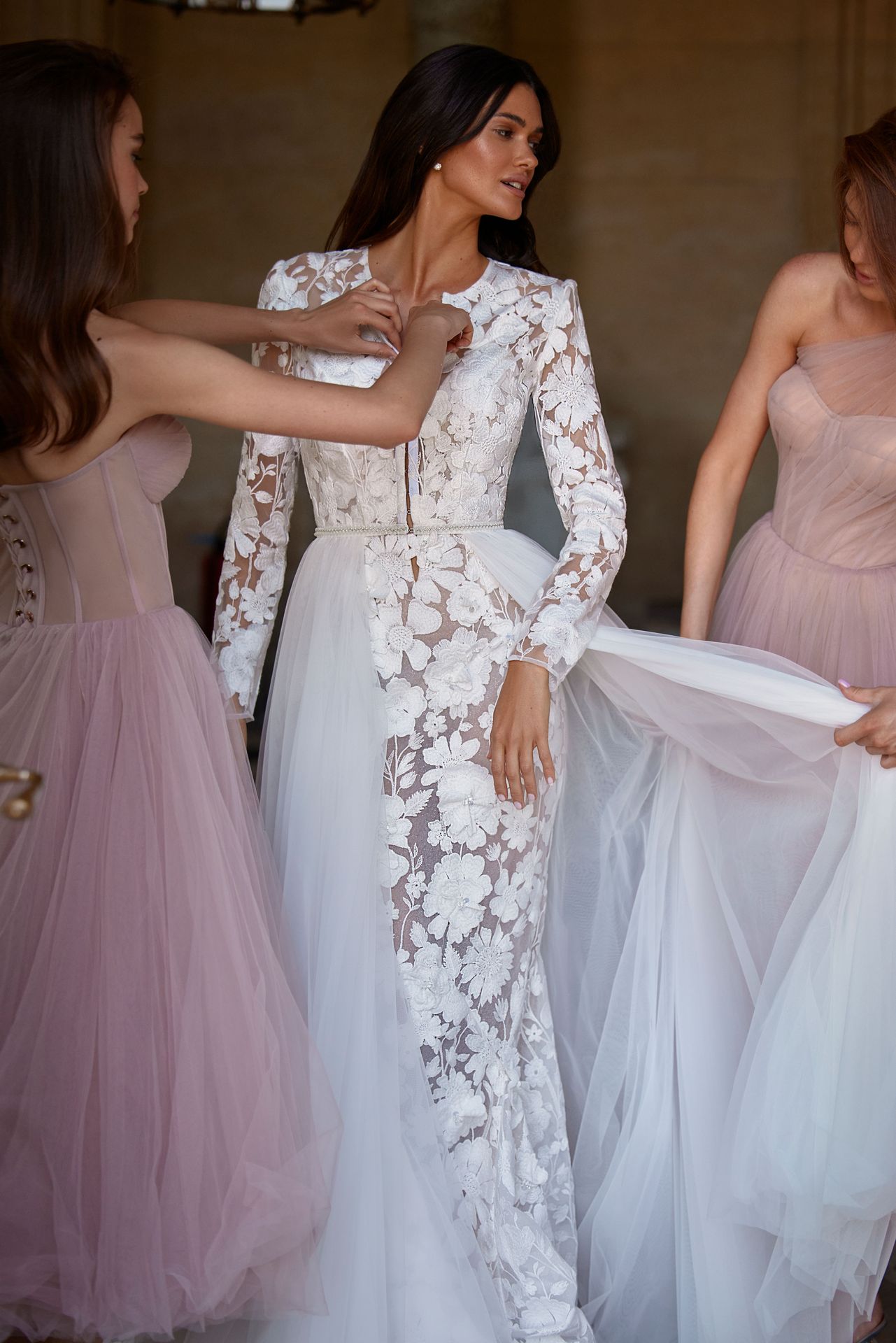 Adorned with 3D flowers lace mermaid-style wedding gown on thin beaded straps and cute embellished detachable bows. Featuring a daring plunging neckline, an open V-back, nude lining, and a long train.