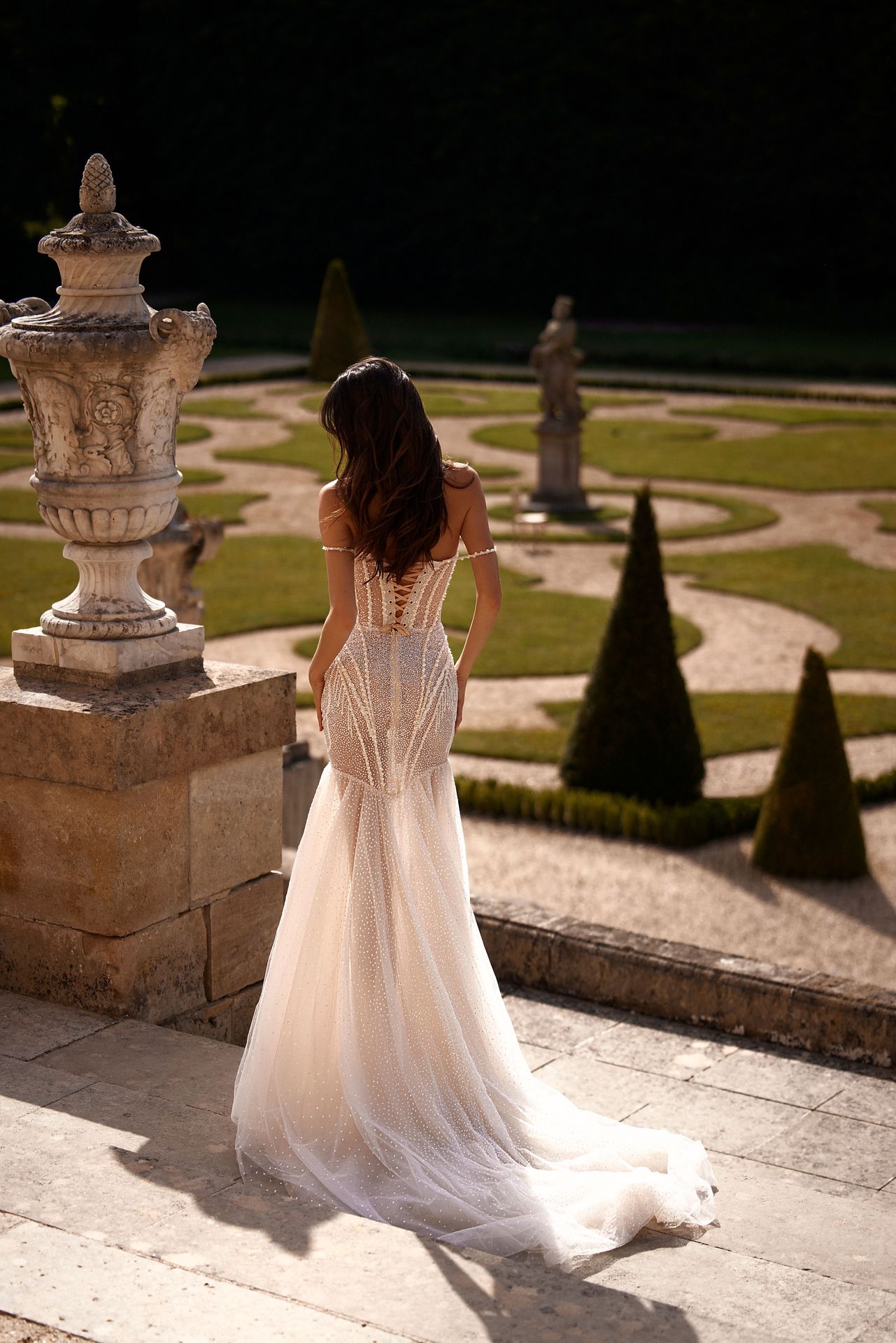 Exceptional mermaid wedding gown fully covered in beadings and rhinestones. Featuring embellished off-the-shoulder spaghetti straps, sweetheart neckline, lace-up closure on the back, rhinestones fringe imitation, and a puffy tulle skirt covered in crystals.