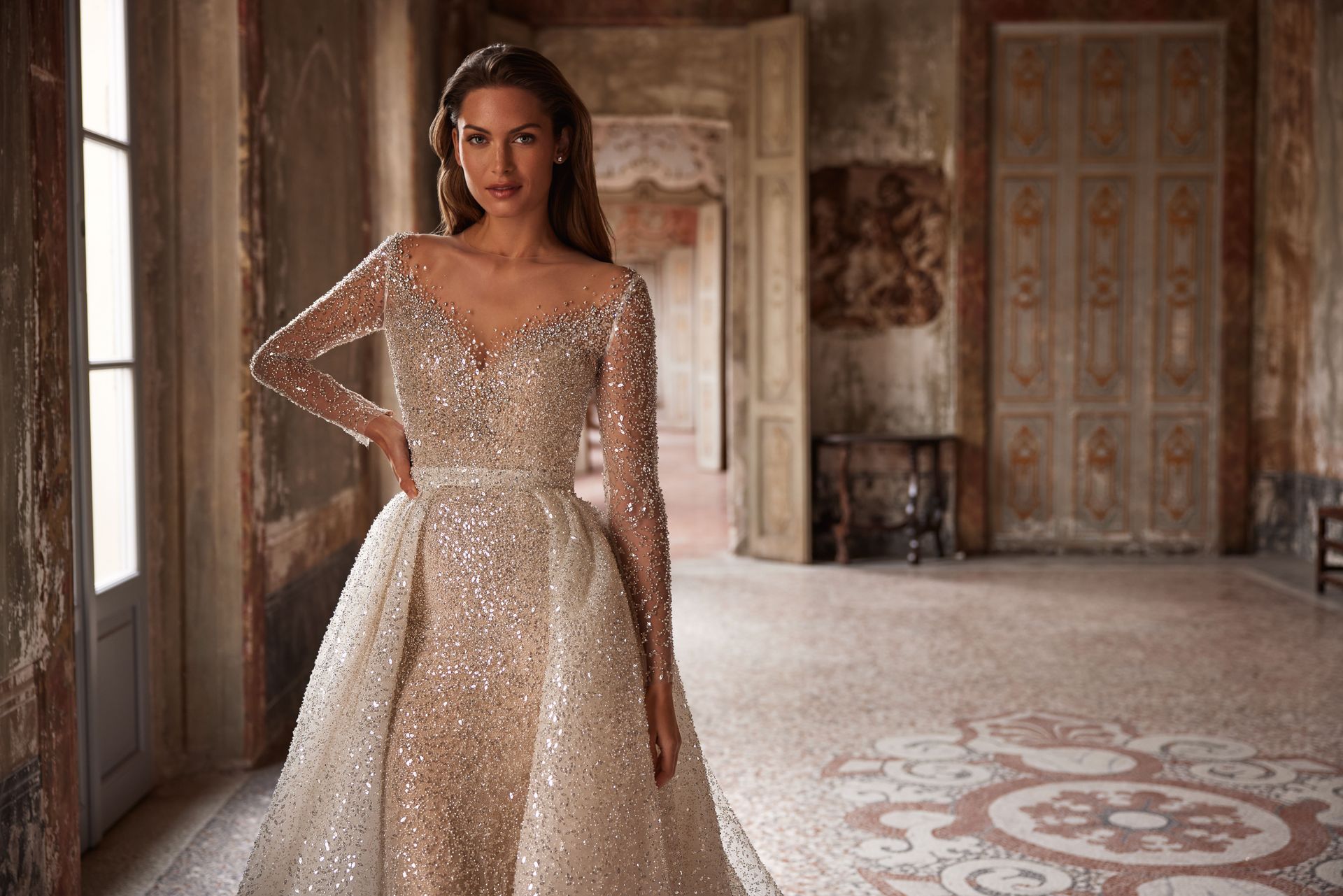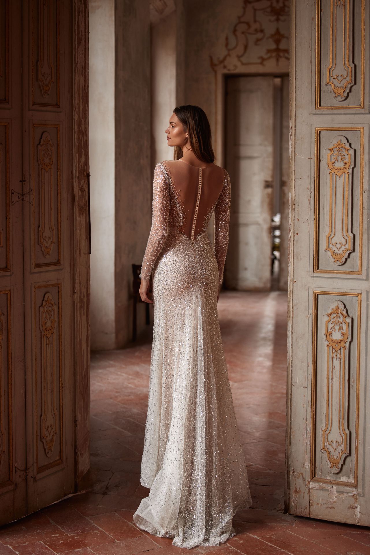 Exquisite fully embellished mermaid wedding gown. Features a semi-transparent bodice with an adorned illusion plunging heart-shaped neckline, sequined long sleeves, a sheer deep buttoned back, and a sparkly maxi skirt.