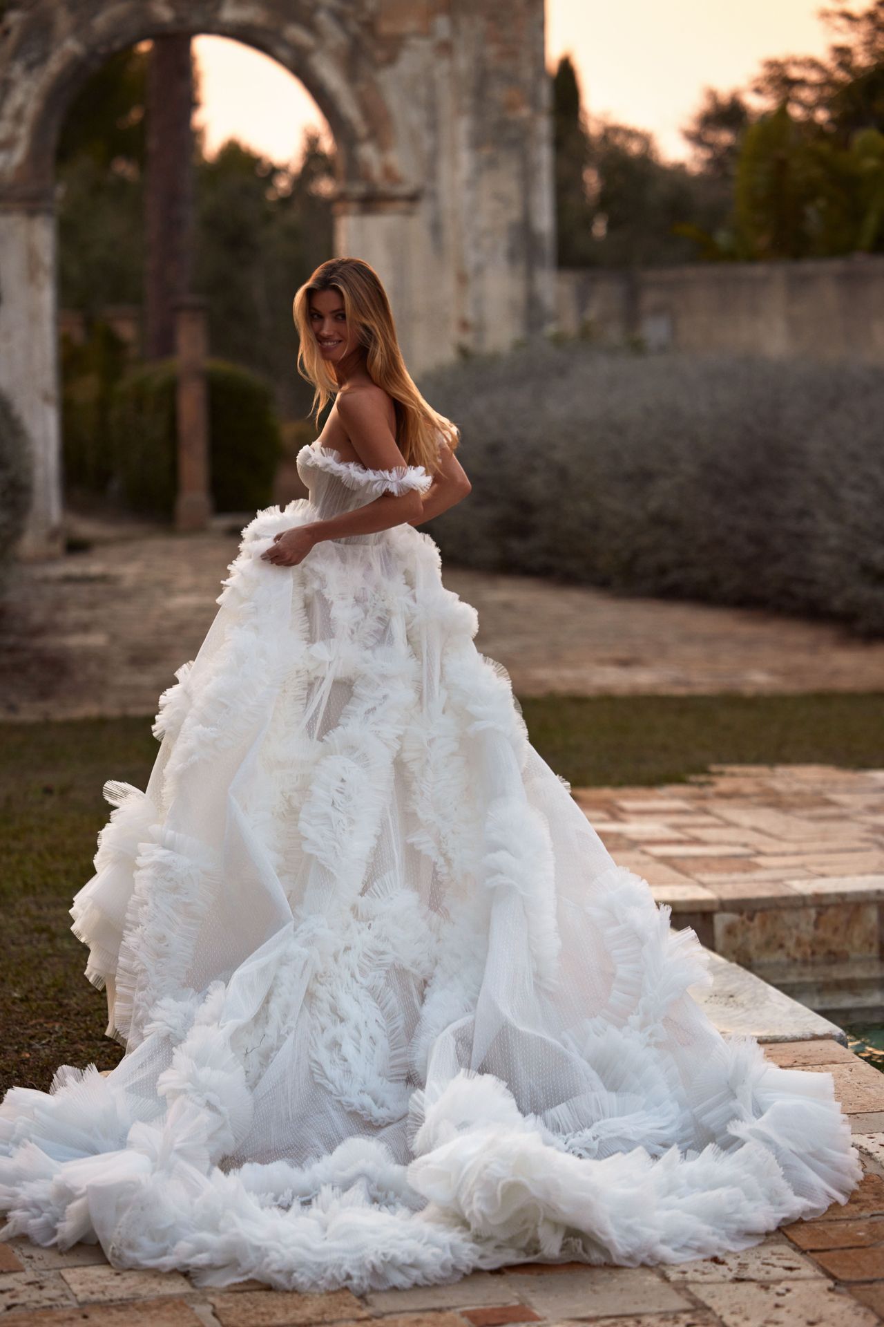 Eccentric princess wedding gown hand-covered in frills appliques. An off-the-shoulder heart-shaped sheer boned corset accentuates the waist and a princess-like skirt, cascading to a waterfall of floor-length layers of embellished organza.