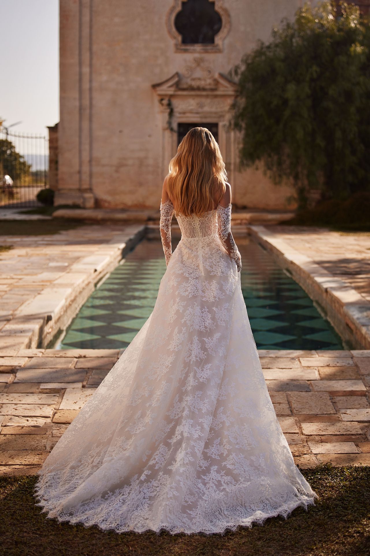 Captivating strapless A-line wedding gown fashioned from the delicate floral chantilly lace. The heart-shaped neckline is intricately embellished with beadings that mirror the chantilly lace pattern. The voluminous tulle princess skirt with a midi train adds a touch of regal splendor to the ensemble. Can be complemented with matching detachable off-the-shoulder long sleeves.