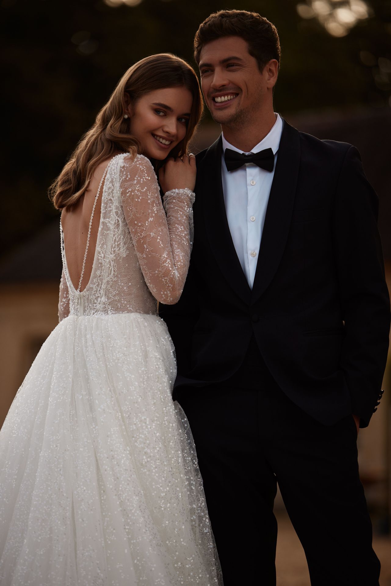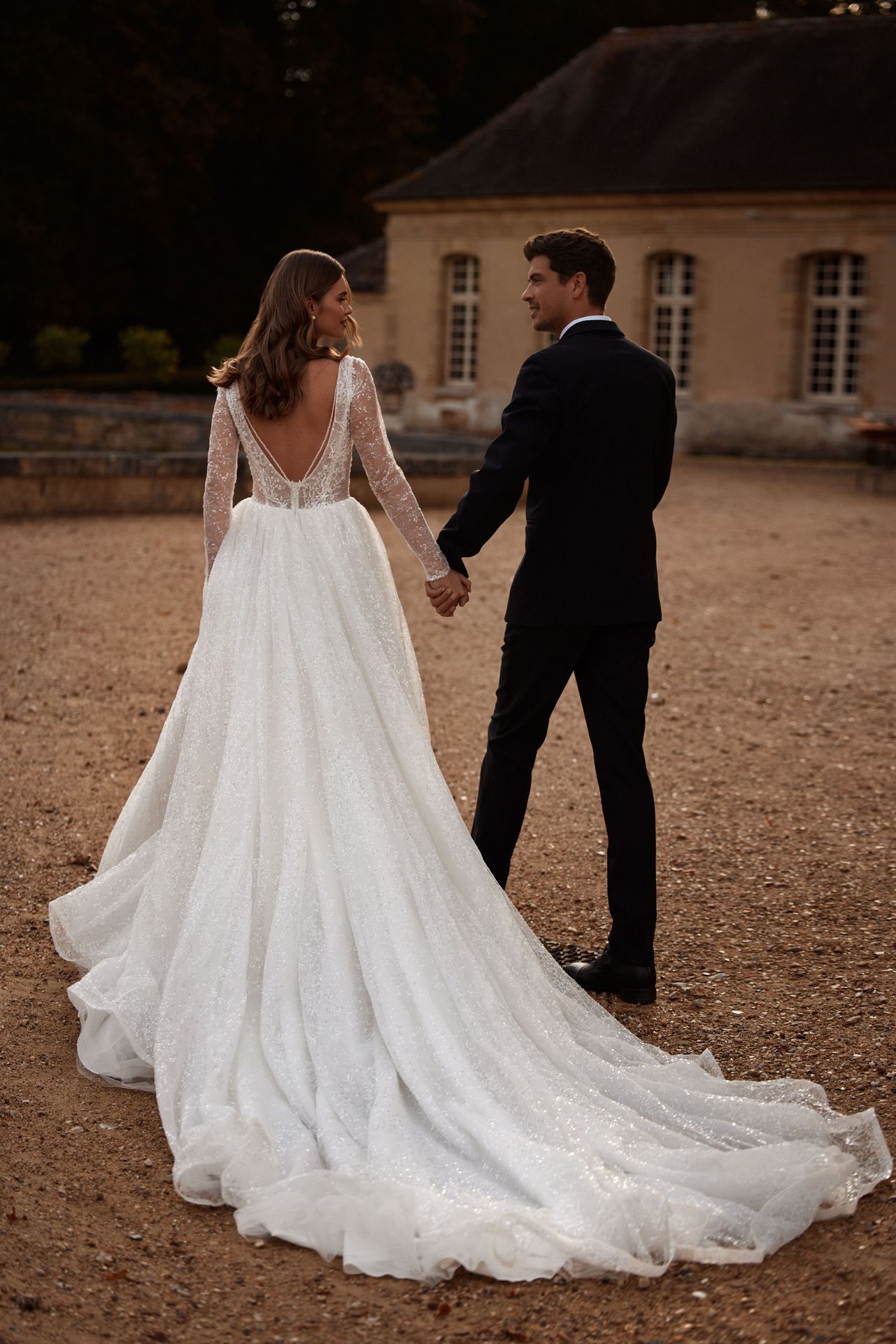Tender long-sleeved wedding gown in ivory. Featuring a semi-transparent lace bodice embellished with sequins, a plunging illusion neckline, shiny sheer long sleeves, a button-up open back, and a sparkling puffy tulle skirt with a long train.