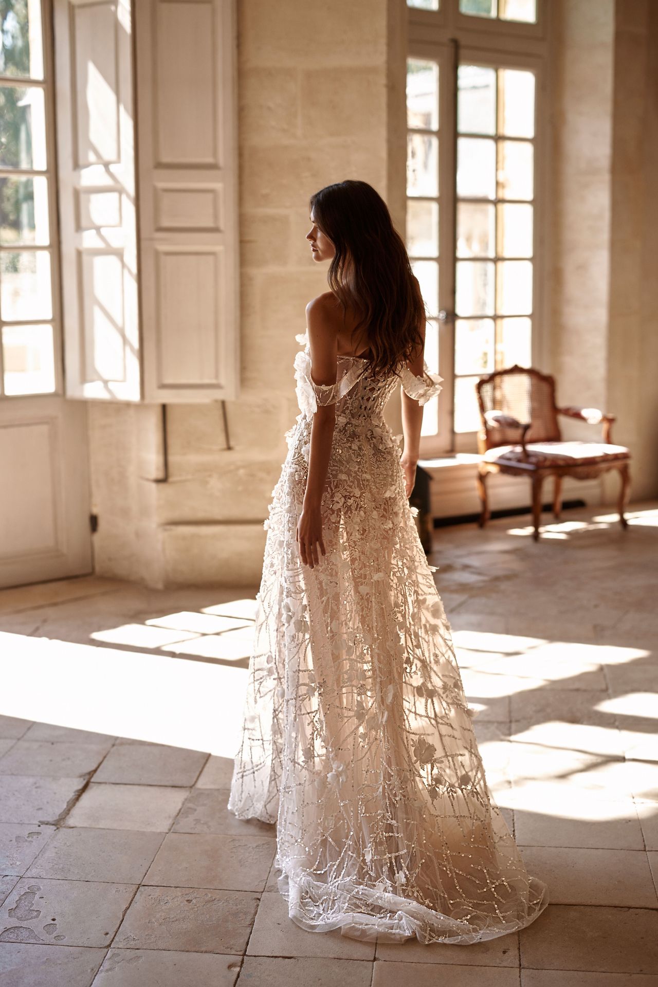 Mesmerizing semi-transparent shiny A-line wedding gown adorned with 3D flowers, sequins, beadings, and pearls. Featuring a sweetheart corset with a plunging neckline, off-the-shoulder tulle sleeves embellished with 3D flowers, lace-up closure on the back, and a short train.