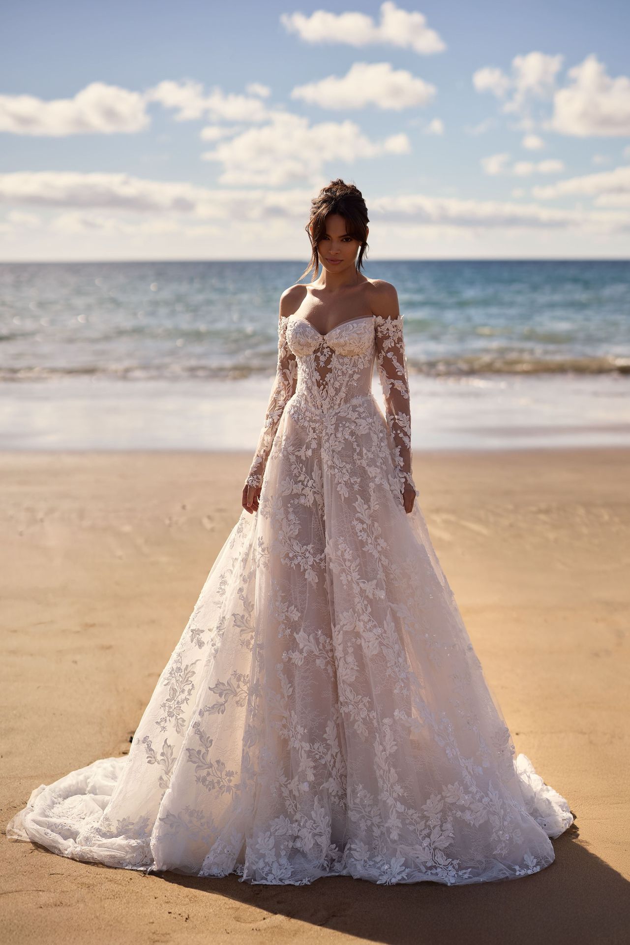 Enchanting long-sleeved off-the-shoulder A-line wedding gown made from lace with floral motifs. Featuring a heart-shaped neckline, a boned corset with a V-shaped sheer insert in the center, off-the-shoulder sheer long sleeves adorned with florals, a back zipper closure, and a voluminous princess-style maxi skirt with a dramatic train.