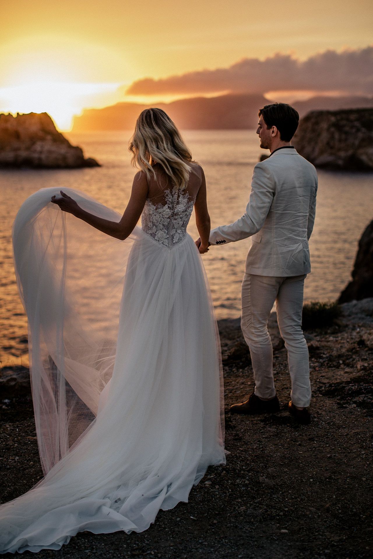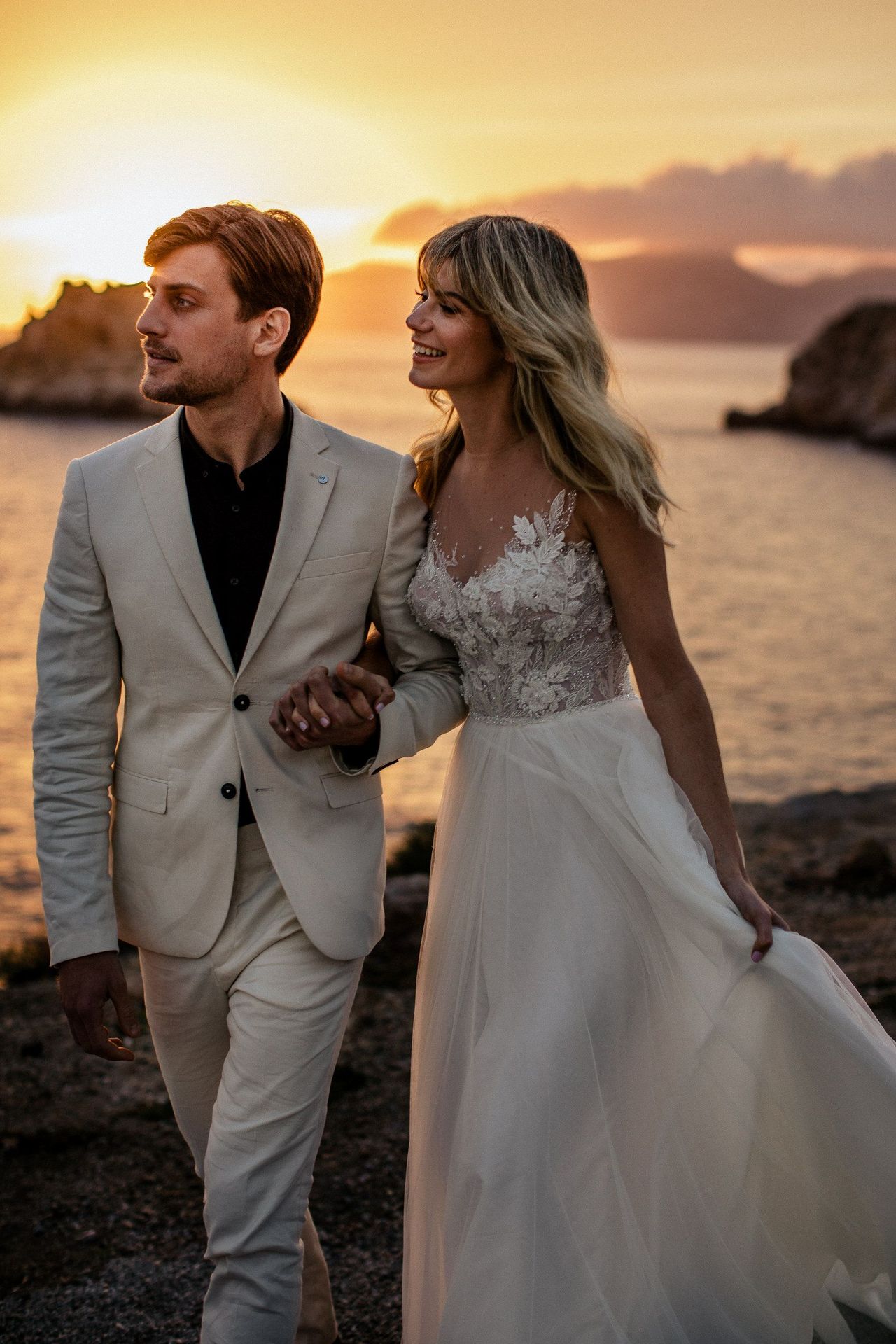 Delicate sleeveless A-line combination wedding dress in ivory colour. Features a heart-shaped neckline, sparkly lace-applique bodice, and flaring tulle maxi skirt with a train.