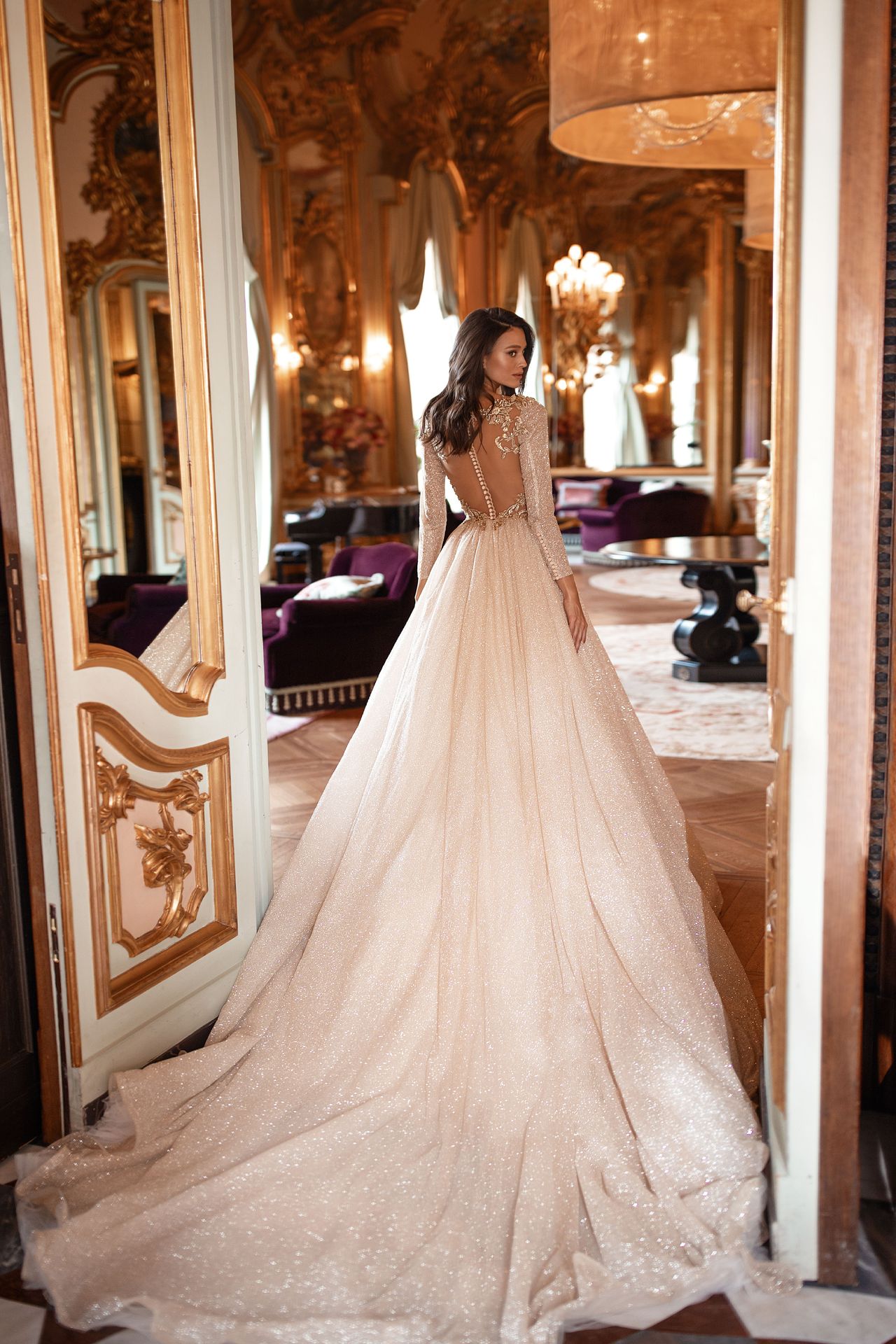 Glitter wedding gown with buttoned long sleeves and back. Features a princess maxi skirt with a long train and exquisite floral detailing on the waist and back. Available in golden or silver color.