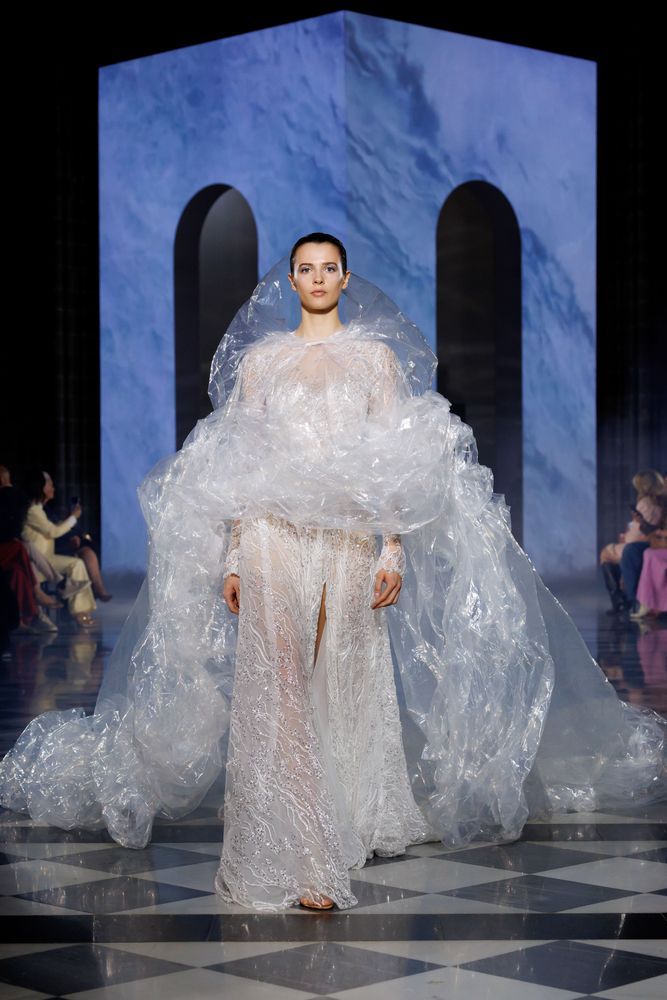 Striking A-line semi-sheer lace wedding gown intricately adorned with shimmering crystals, sequins, and beads, radiating pure opulence. Featuring a fitted V-shaped corset bodice, a high turtleneck collar, long sleeves, and a closed buttoned back, all lavishly embellished to create a breathtakingly detailed ornament. Volumentric maxi skirt features a subtle slit for effortless movement, blending comfort with a hint of sensuality. It's an A-line shape that flatters every body type, making it a timeless classic designed with both style and ease in mind.